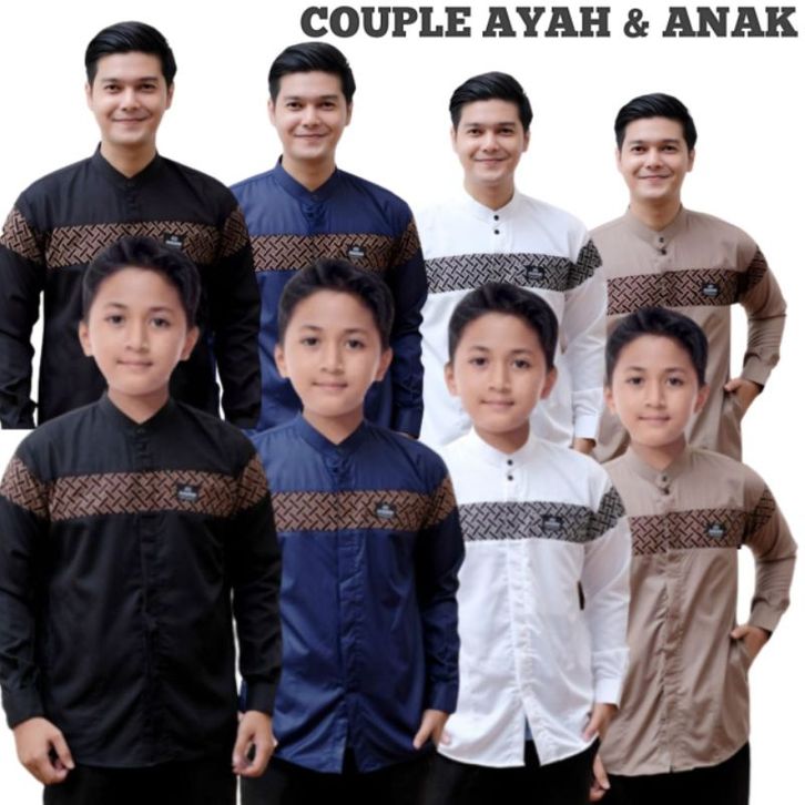 Baju Koko Couple Ayah dan Anak Laki-laki Motif Batik Kobata Qynang Baju Koko Pria Dewasa Lengan Panjang