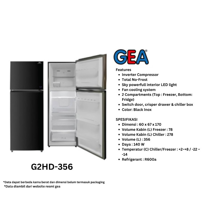 GEA Home Refrigerator G2HD-356 Lemari Es Kulkas 2 Pintu GEA 356 Liter - Khusus Jabotabek