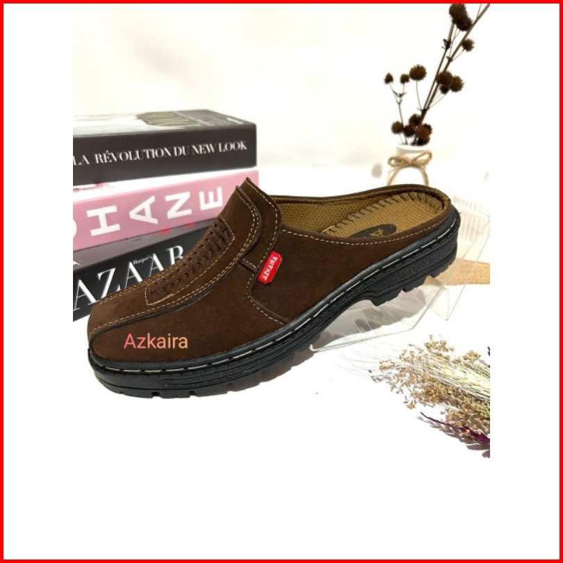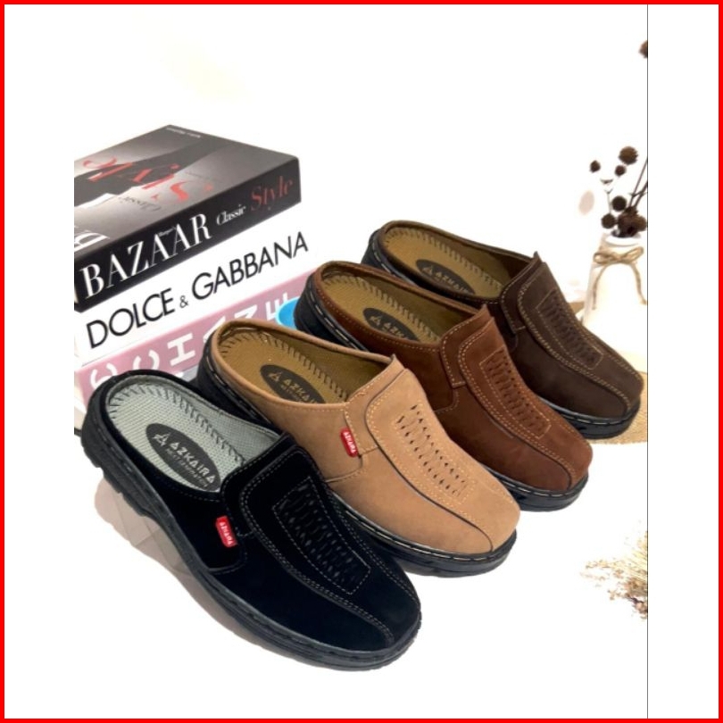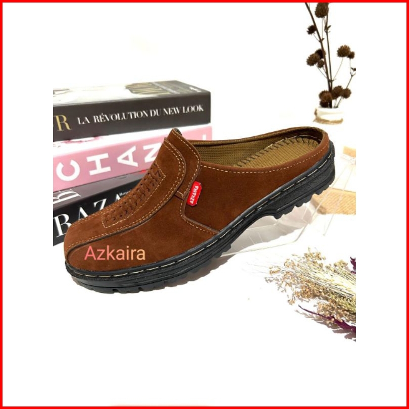 Sandal Sepatu Slop Bustong Pria Kulit Suede Nobuk Sintetis Lentur Casual Cowok Selop Premium Terbaru