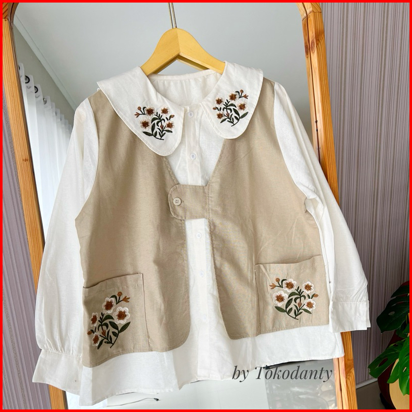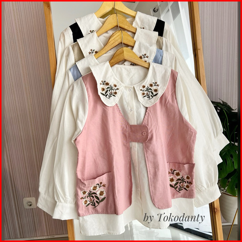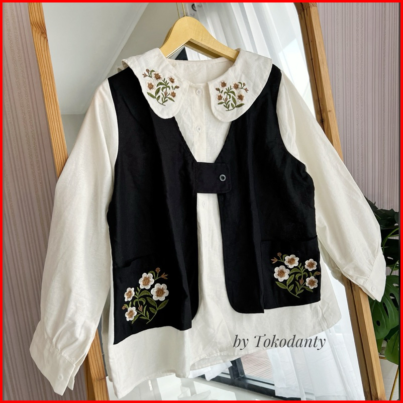 Megumi Shirt - Atasan Wanita - Kemeja Bordir - Rompi Cantik - Katun Linen - Korean Style