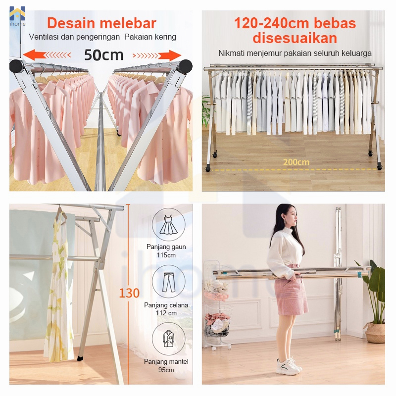 DISCOUNT Ihome Jemuran Baju Jemuran Pakaian 240cm Gantungan baju Tiang ganda Dapat Dilipat / Dapat Diperpanjang Stainles