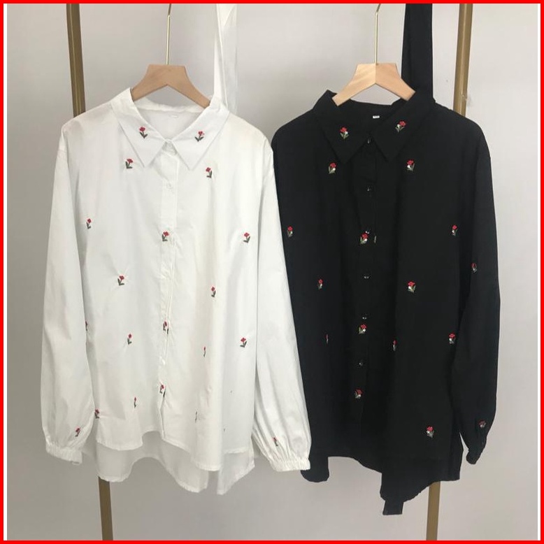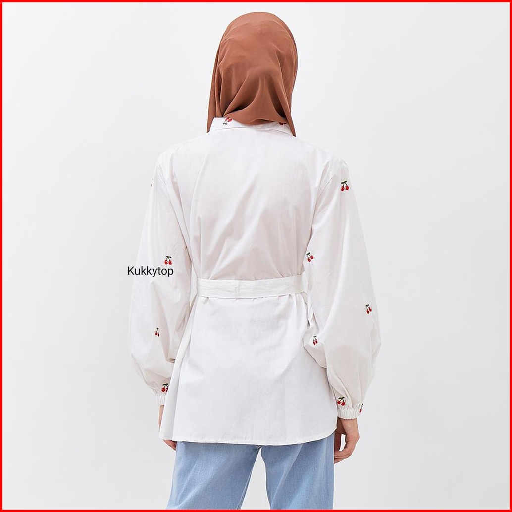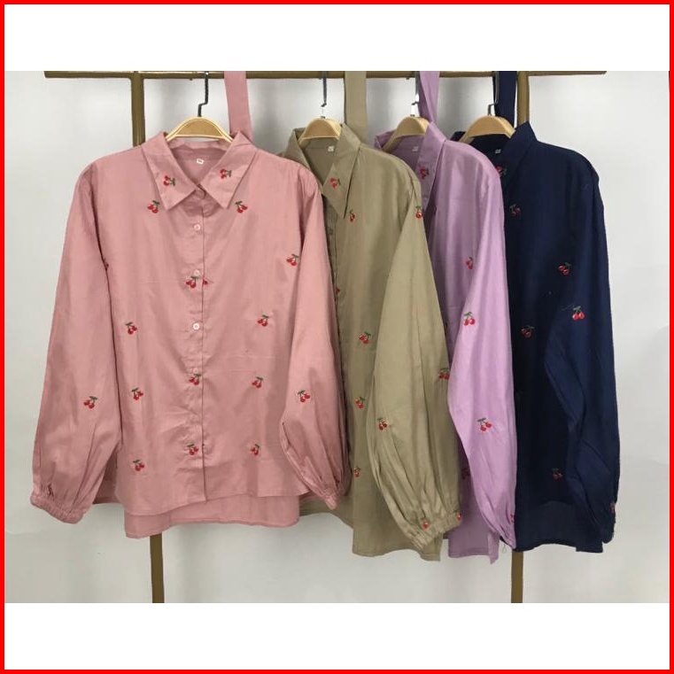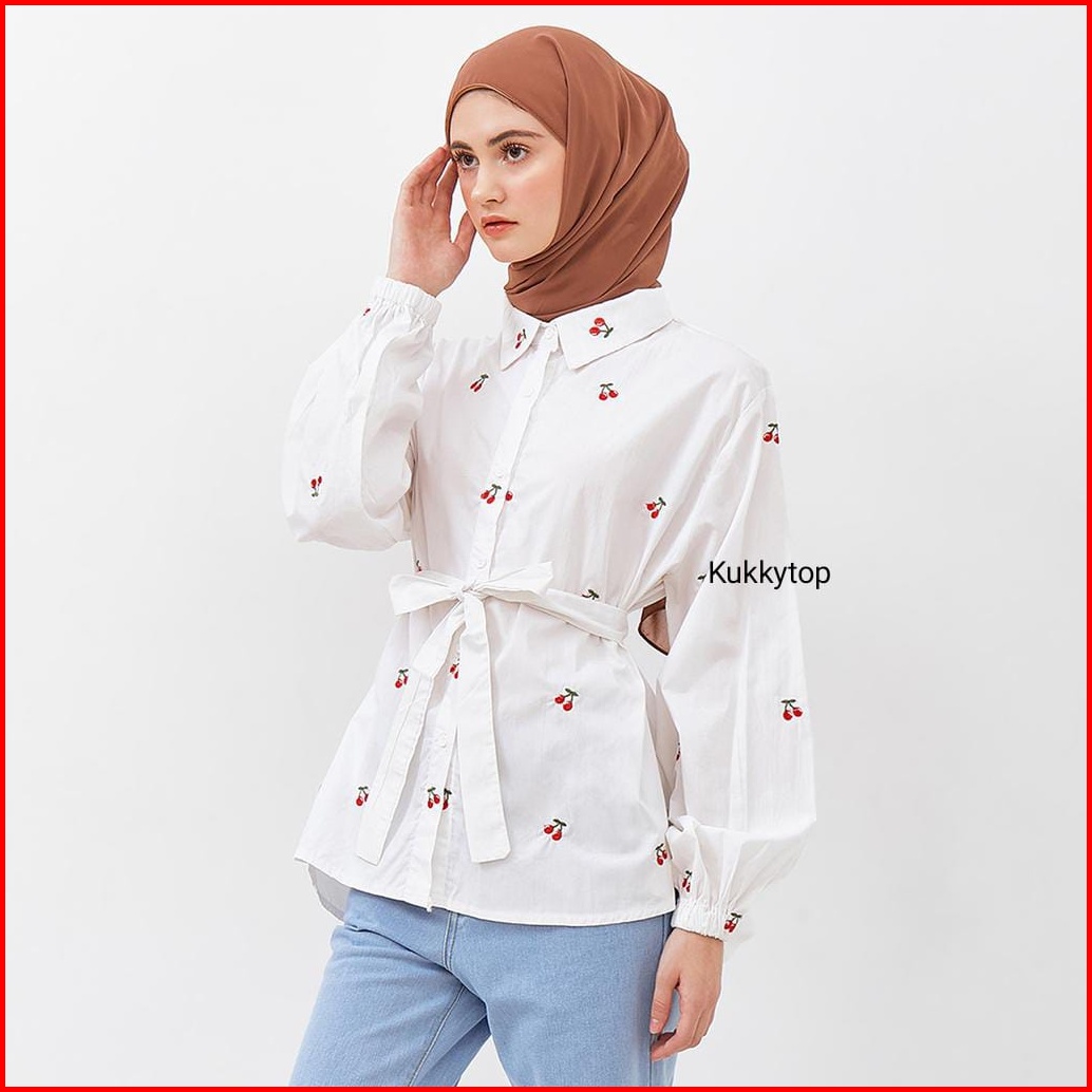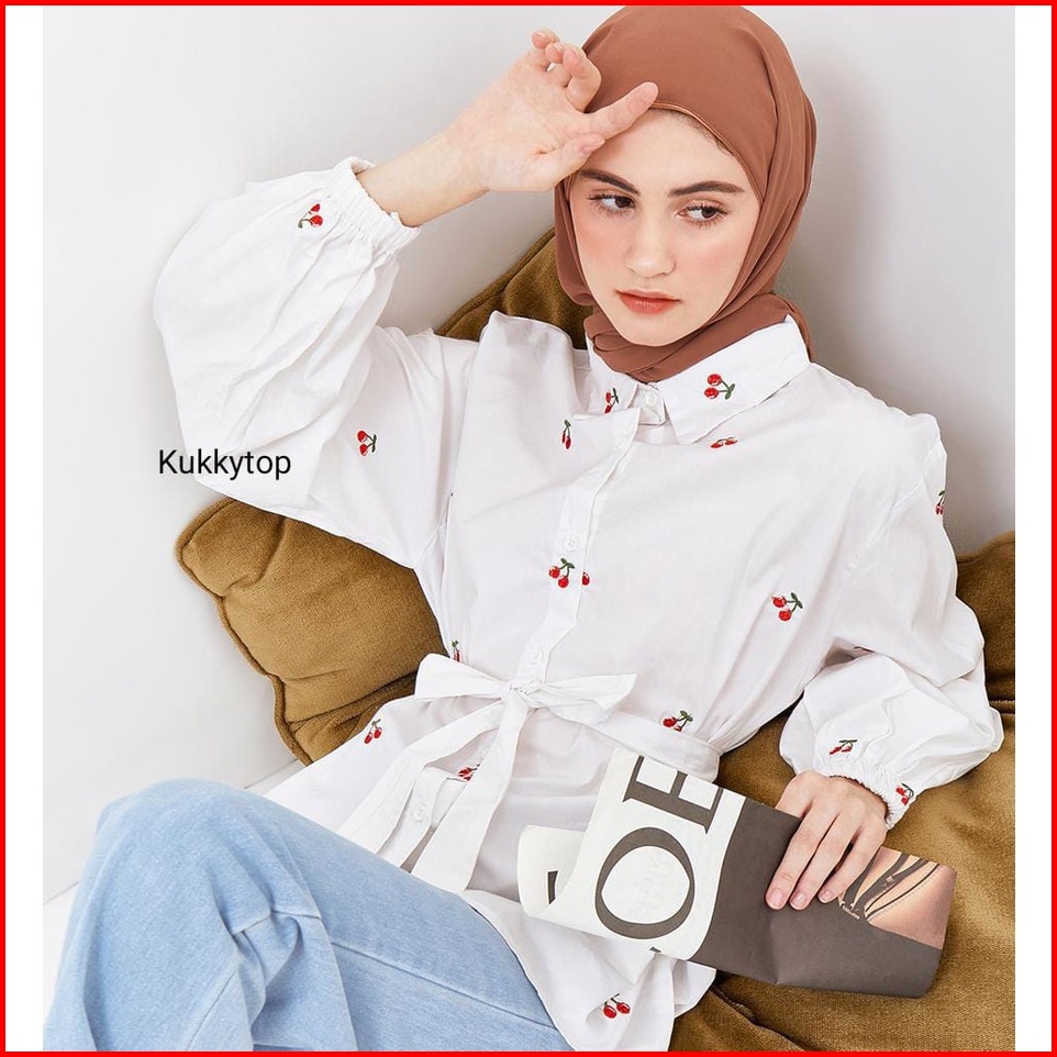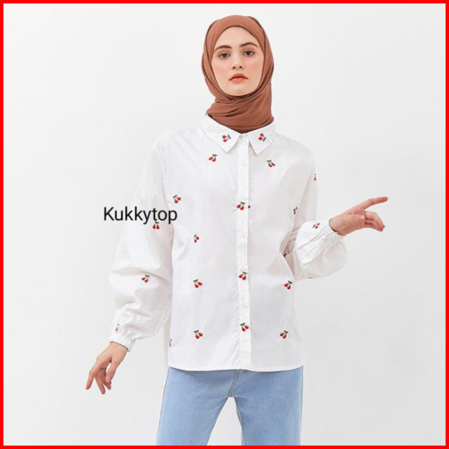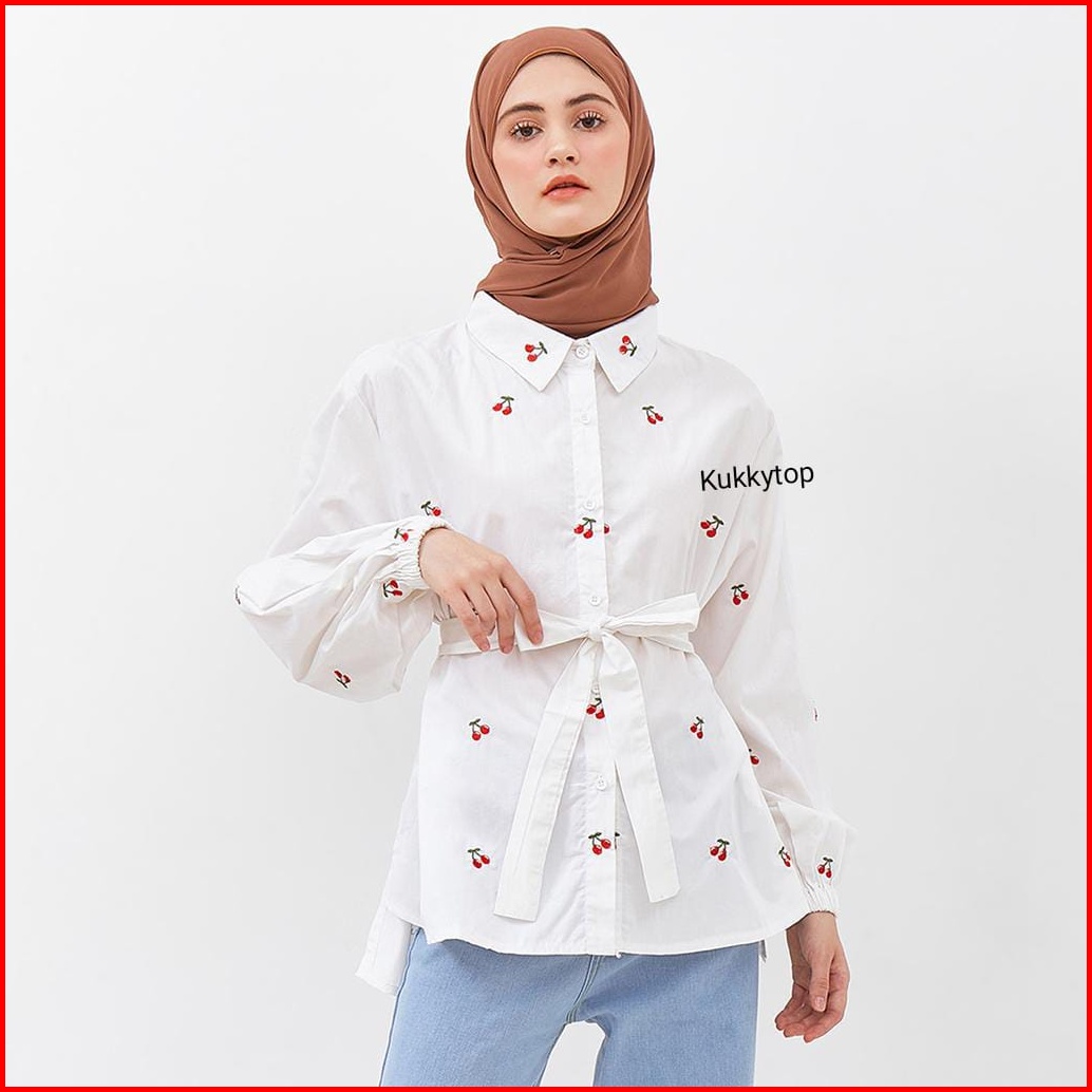 Kukky Top Kemeja Katun Bordir Cherries Shirt Baju Atasan Wanita Oversize Korean Style 12755
