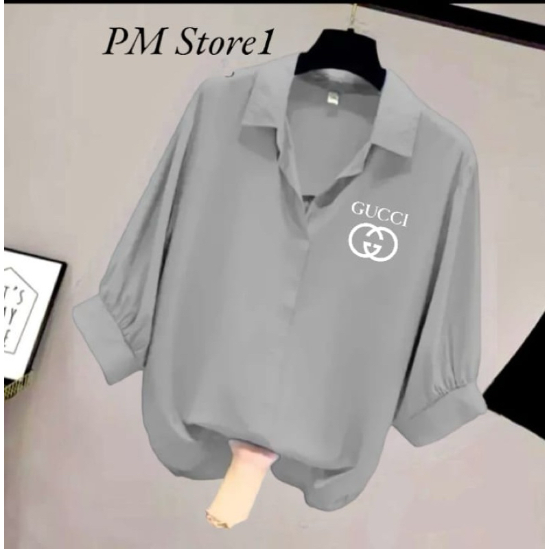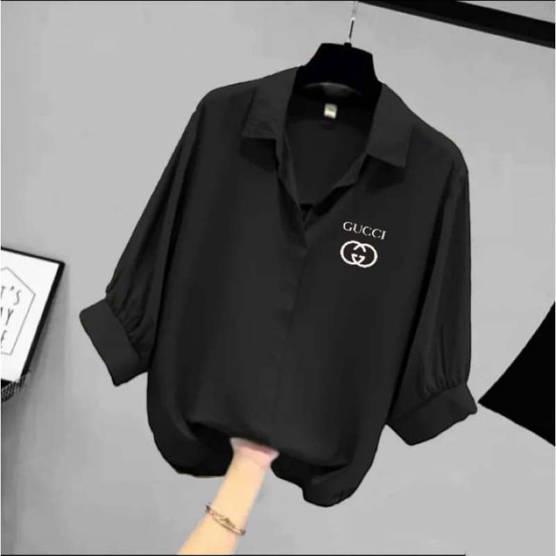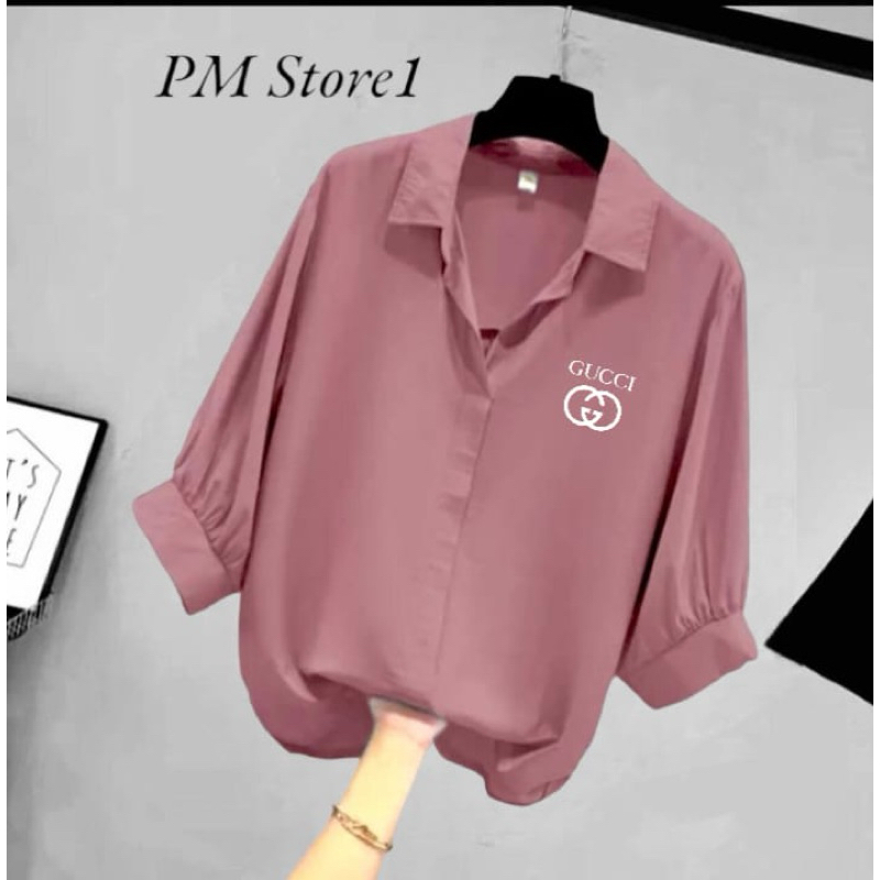 (Gratis Ongkir) Blouse Wanita Leher V Logo Samping / Kemeja Wanita V Korean Style / Baju Wanita Lengan Balon 3/4