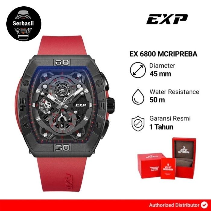 Jam Tangan Pria Exp Chronograph EX 6800 MCRIPREBA Black Dial Red Rubber Strap