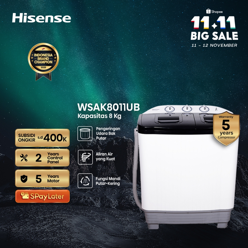 Hisense Mesin Cuci WSAK8011UB Top Loading Twintube Kapasitas 8KG 2 Tabung Bukaan Atas Pengeringan Udara Bak Putar Aliran