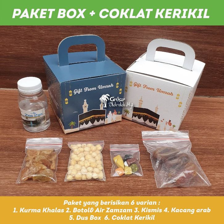 (50 PCS) Paket Oleh Oleh Haji dan Umroh Dus kotak Air Zamzam ori + Botol 80ml + Kurma Khalas + Coklat Kerikil