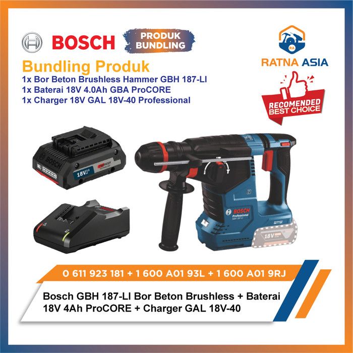 Bosch GBH 187-LI Bor Beton +Baterai ProCORE 18V 4Ah+Charger GAL 18V-40