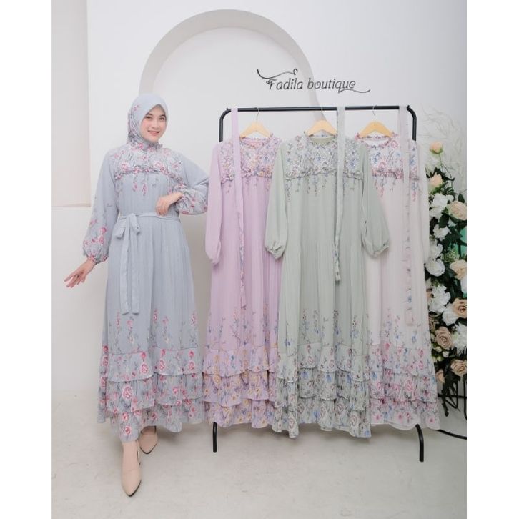 Adella Dress Ceruty Printing Motif Plisket Hijab Segiempat Premium Busui Friendly Dress Kondangan Modern Wanita Kekinian