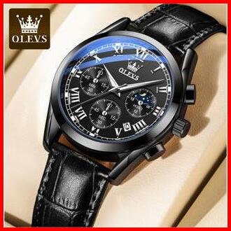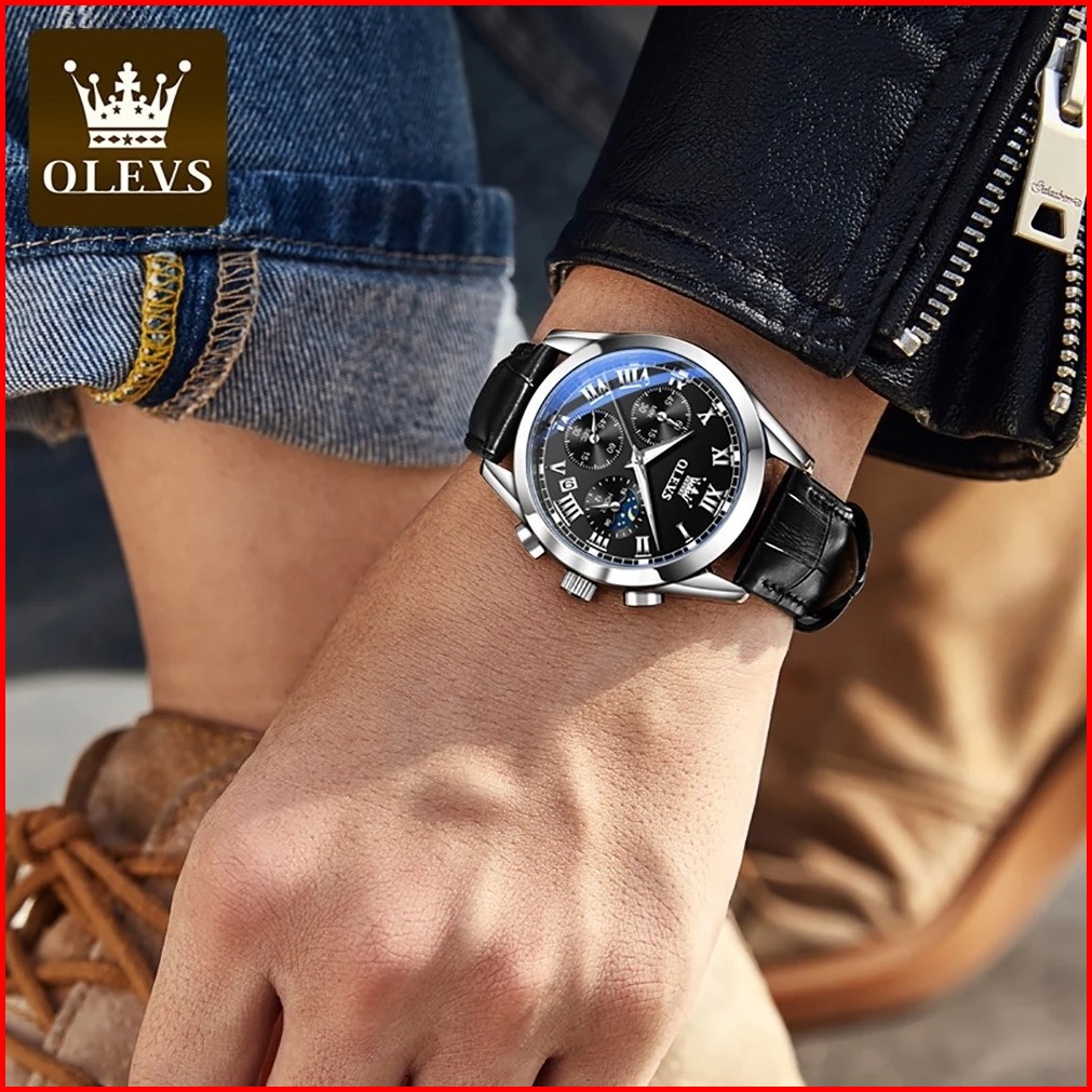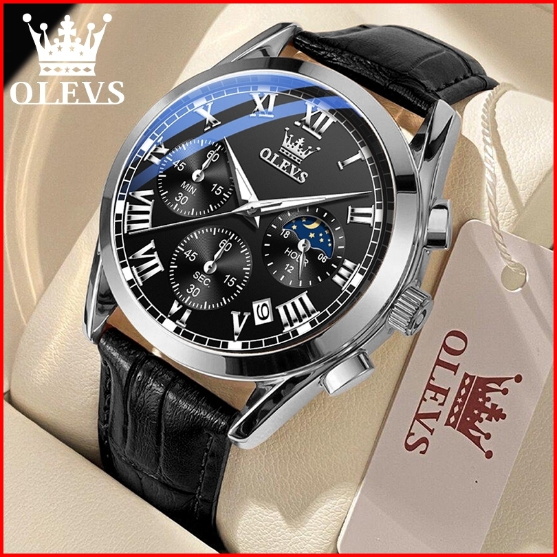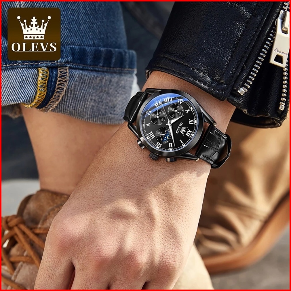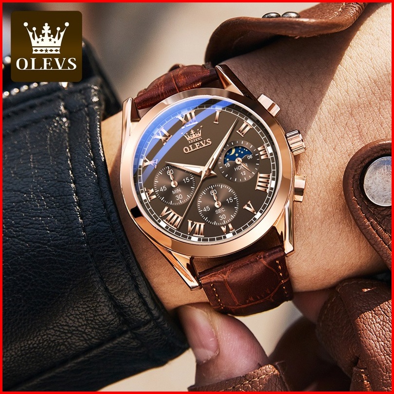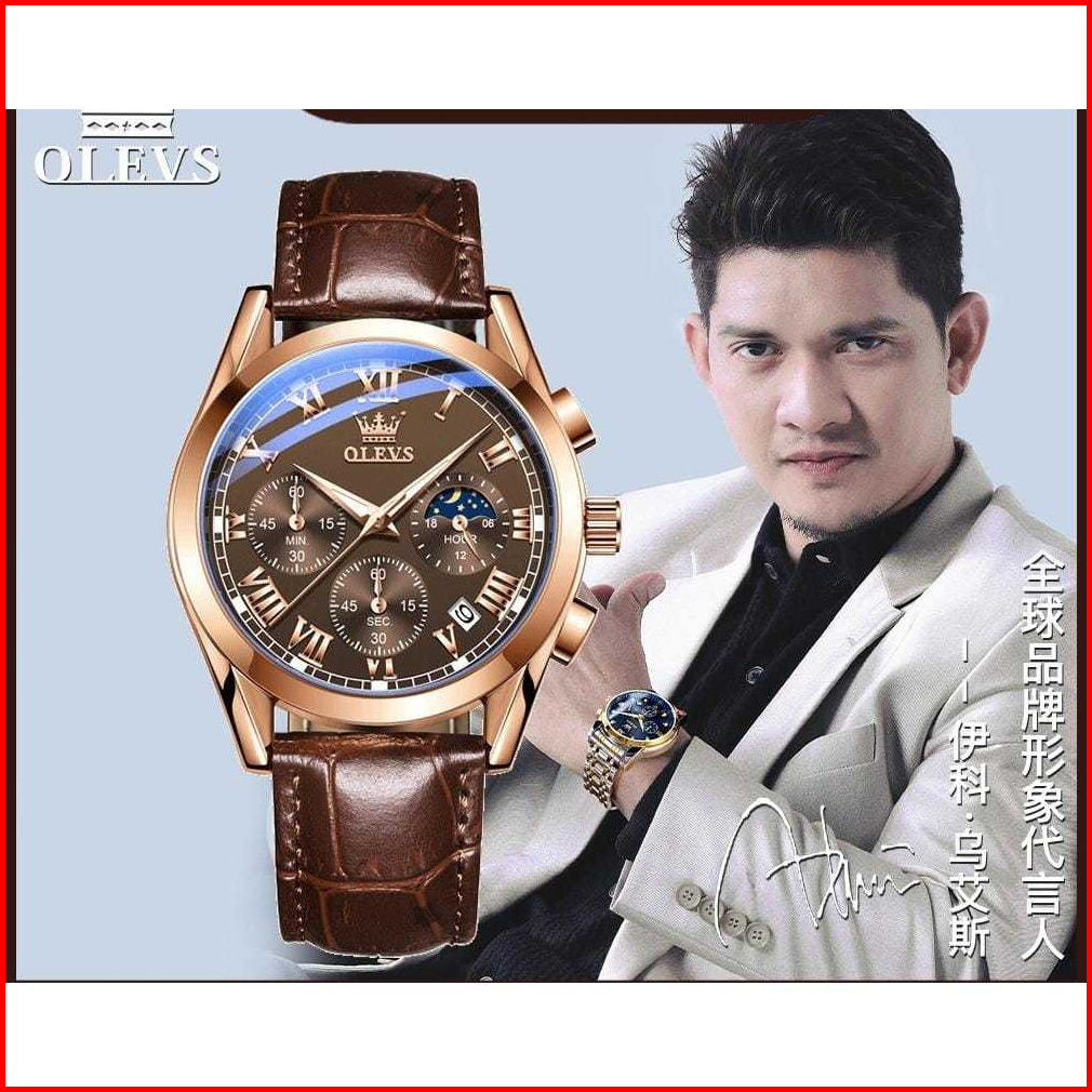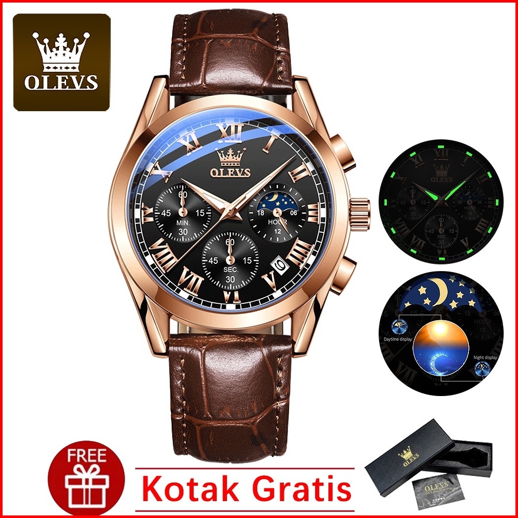 Olevs Jam Tangan Pria Original Anti Air Kulit Tahan Keren Led Hitam Coklat Luxury Chronograph Watch