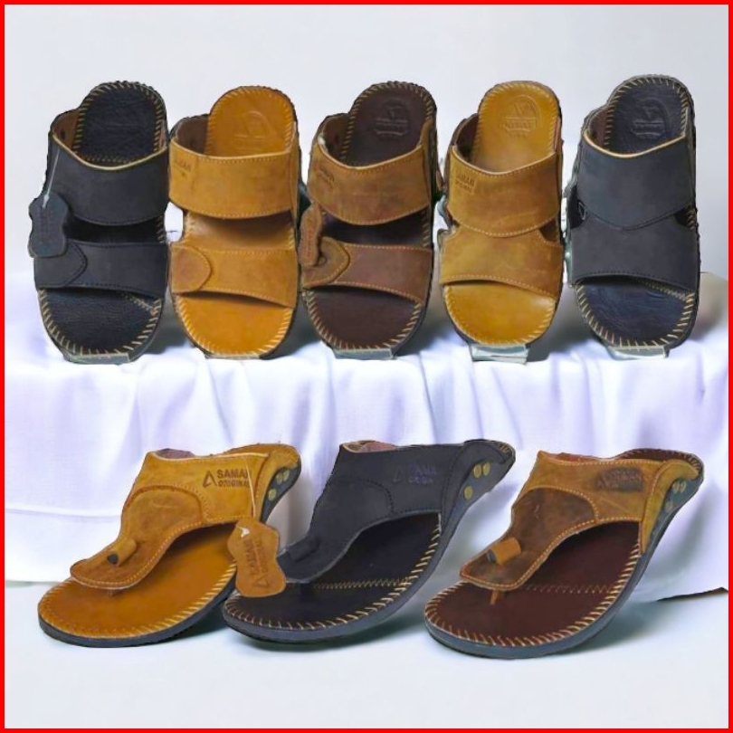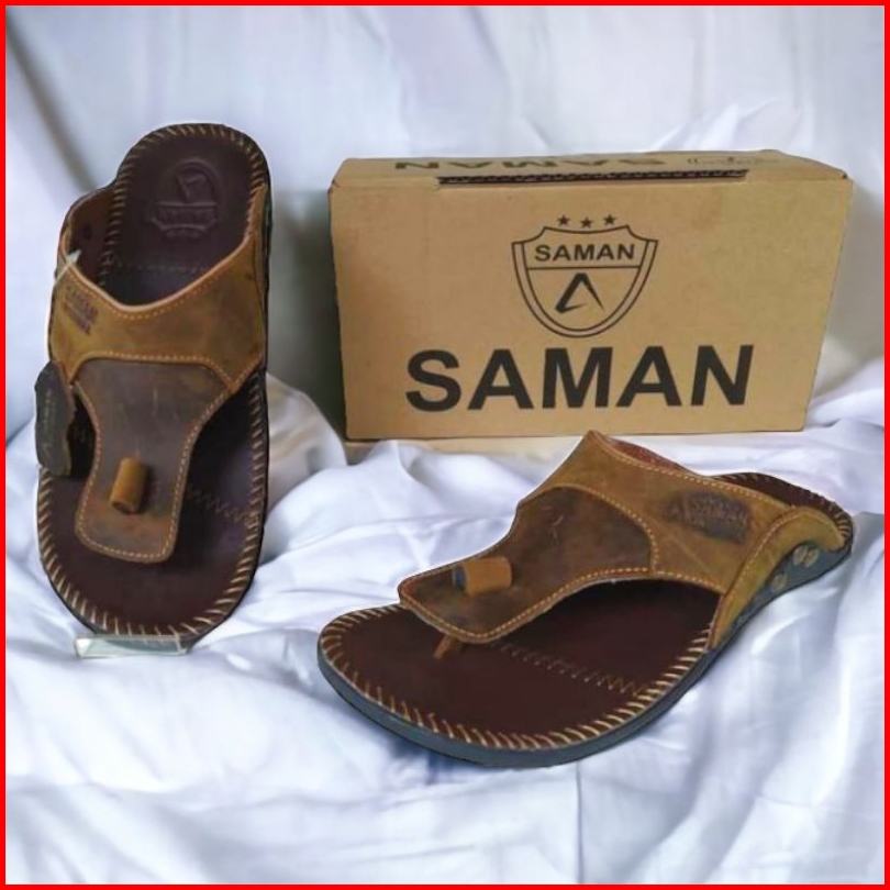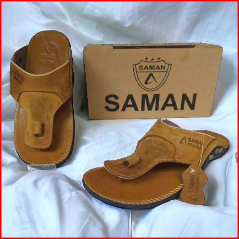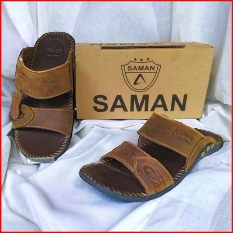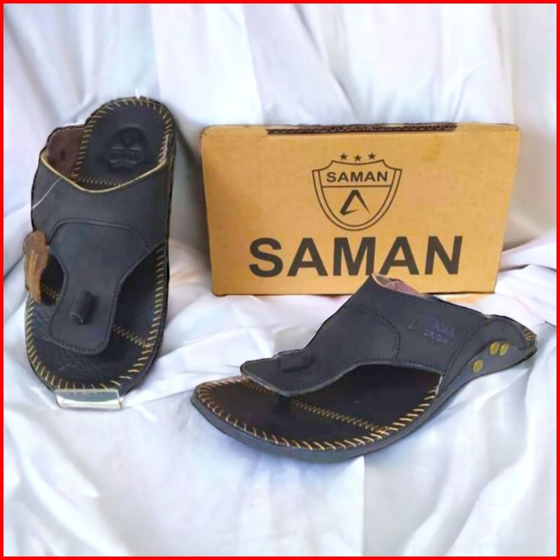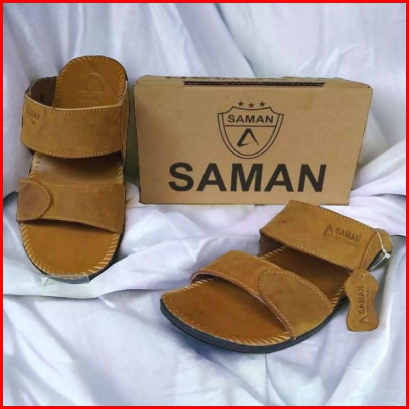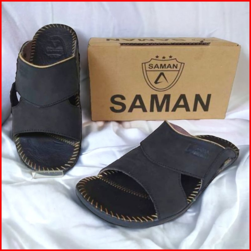 Sandal Kulit Pria Asli Saman Original Ready 3 Model 3 Warna Hitam Cokat Tua Coklat Muda Slop Japit Slip On Kasual Ukuran