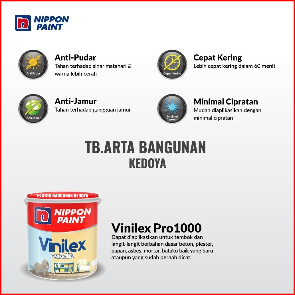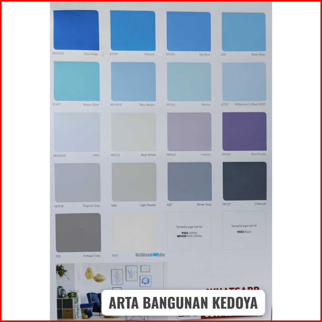 PUTIH SUPER KENTAL, 9102 White, SW Super White, 1001 Brilliant White, BS 9103 Black, 1158 Terracotta, 1685 Mustard, 1686 Soft Jalapeno, 602 Durian, 631 Yellow KMX, 657 Bright Green, 659 Misty Blue, 6604 Smeraldo, 661 Pink, 667 Mint Green, 675 Cottage Carrot, 678 Hibiscus Red, 686 Light Pewter, 687 Miner Gray, 755 Antique Grey, BGG1619T Green Gauze, BGG1681D SpringVigor, BS3033 Broken White, BS3040 Cream, BS8090 Sakura, K1157 M III Blue2000, K1179 Atlantic, K1671 Moon Glow, MX3004 Confire Rose, MX3011 Honey Sky, MX3015 Blue Reveur, MX3025 SWS, MX3030 Vert Clair, MX3031 Jaune Frais, MX3149 Rouge, MX3155 Dos Indigo, NP 200 Crystal Lime, NP 211 Yellow, NP 213X Lime Green, NP 218 Tropical Grey, NP 222 Latansa Green, NP 227 Charcoal, NP 230 Jasmine, NP 231 Harbor Blue, NP 233 Green Freeway, NP 234 Earth Yellow, NP 236 Cucumber, NP 237 Light Lime, NP 238 Lettuce, NP 240 Honey Tone, NP 243 Lily White, NP 245 Marina, NP 247 Goby Sands, NP 249 Sky Blue, NP 251X SunsetYellow, NP 253X Autumn Green, NP 254 Nice Purple, NP 273 Blue White, NP 437 Corn Flake, NP 438 Soft Spring, NP 439 Milk White, NP 440 Natural Cream, NP 441 Summer Hay, NP 442 Violetta