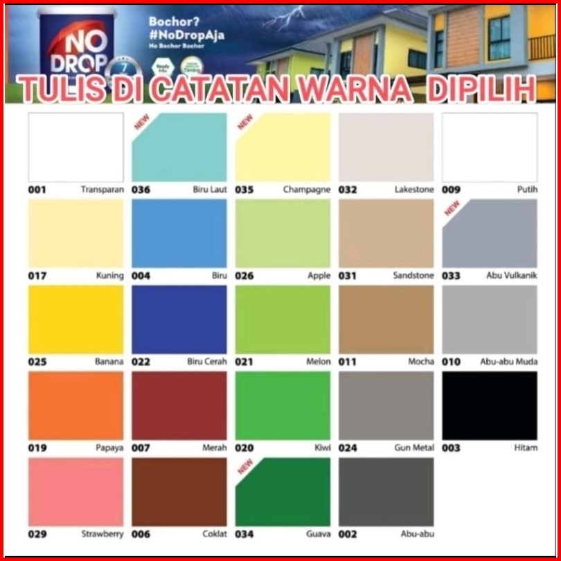 001/transparan, 036/biru laut, 035/champagne, 032/lakestone, 009/putih, 017/kuning, 004/biru, 026/apple, 031/sandstone, 033/abu vulkanik, 025/banana, 022/biru cerah, 021/melon, 011/mocha, 010/abu abu muda, 019/papaya, 007/merah, 020/kiwi, 024/gun metal, 003/hitam, 029/strawberry, 006/coklat, 034/guava, 002/abu abu, Bw/briliant white, 065/peachy, Mw/Mwhite, 060/pineapple, 061/oranye, 057/lime, 063/sakura, 062/carrot, 058/tosca, 064/red apple, 066/safari, 059/biru dongker, N8 006/dry woodland, Hijau sage, Mellow mornings, Pink sunset, Soft petal, Happy valley, Beige harmony, Little sandcastle, What a felling, Honeymoon ave, Creamy milkshake, Sugar mint, Drifting clouds, Paper plane, Purple poppy, Silver tip