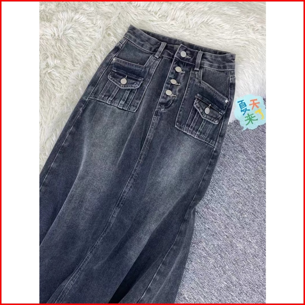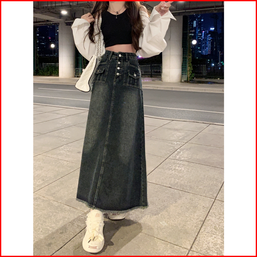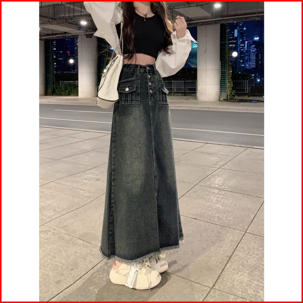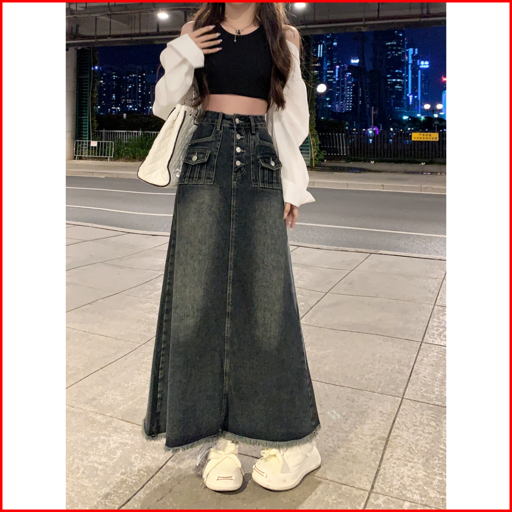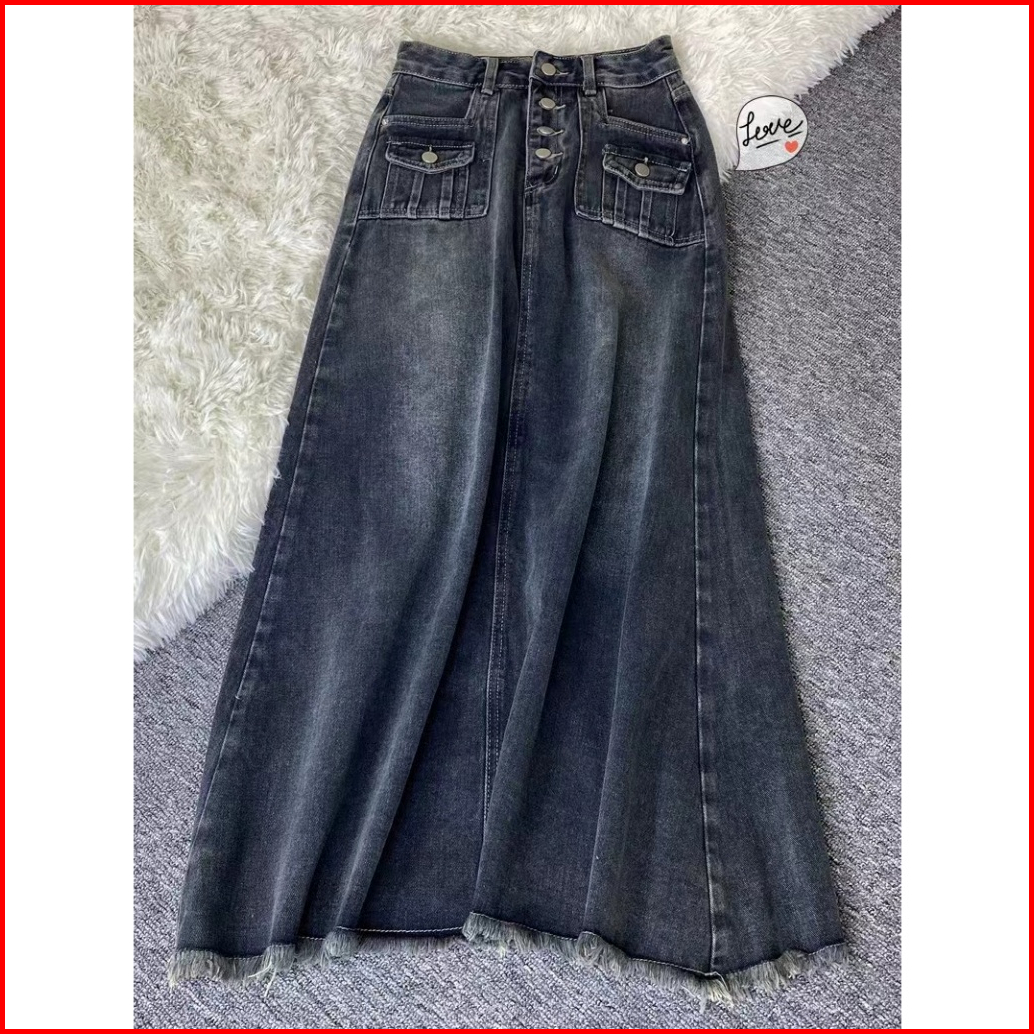 Forteid Rok Korean Style Highwaist Rok Denim Kekinian Panjang Wanita Loose Causual A-line Skirt Retro Rok Midi Terbaru P