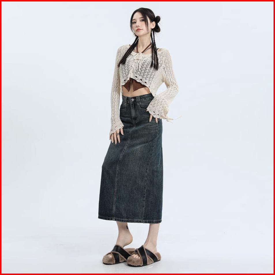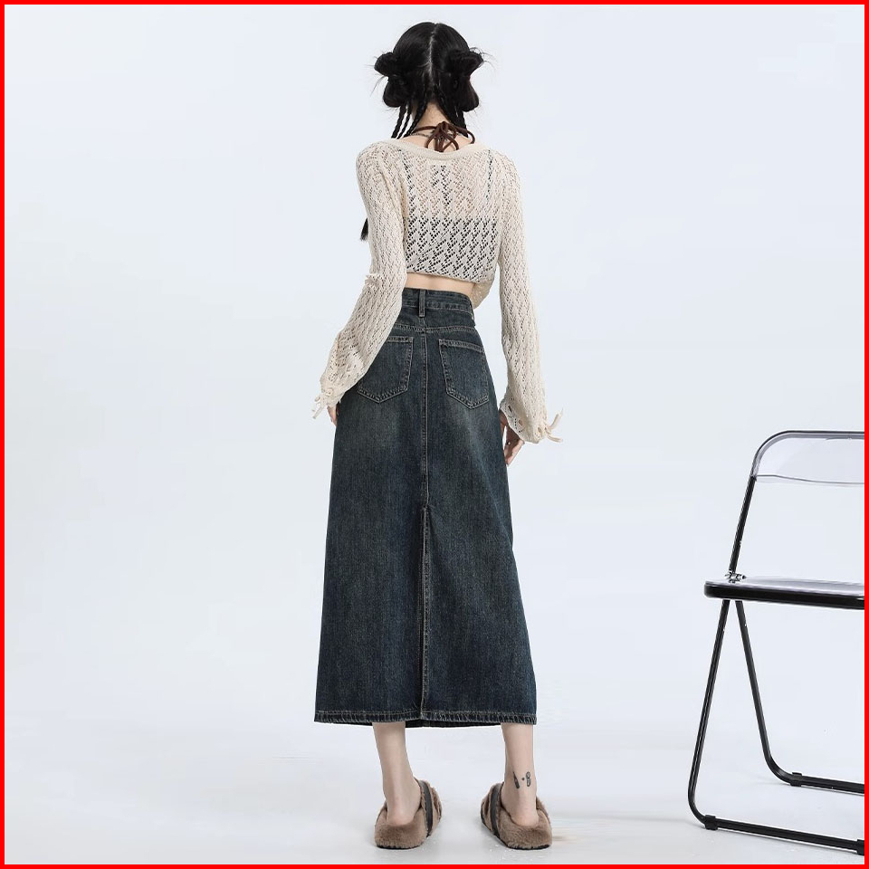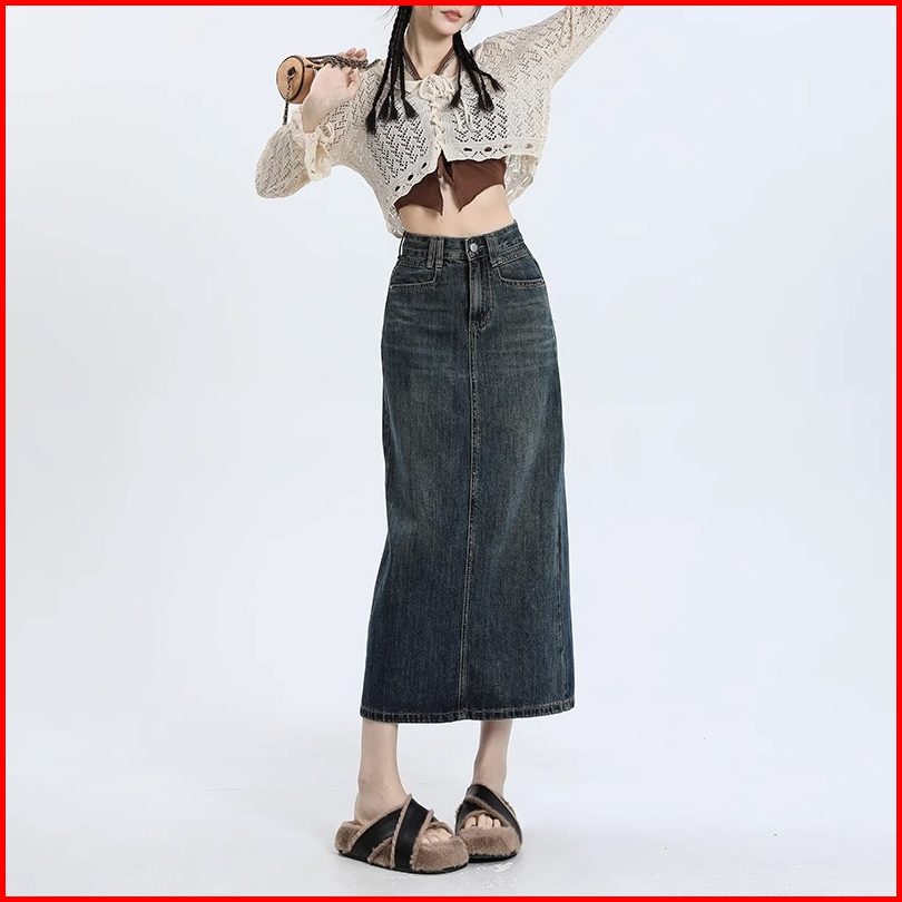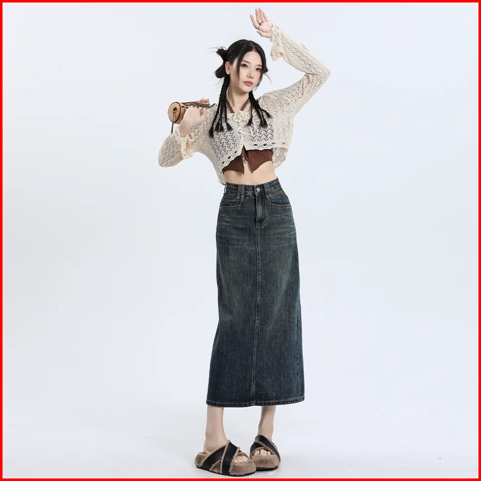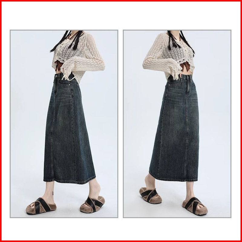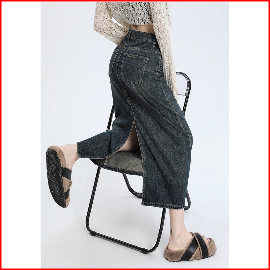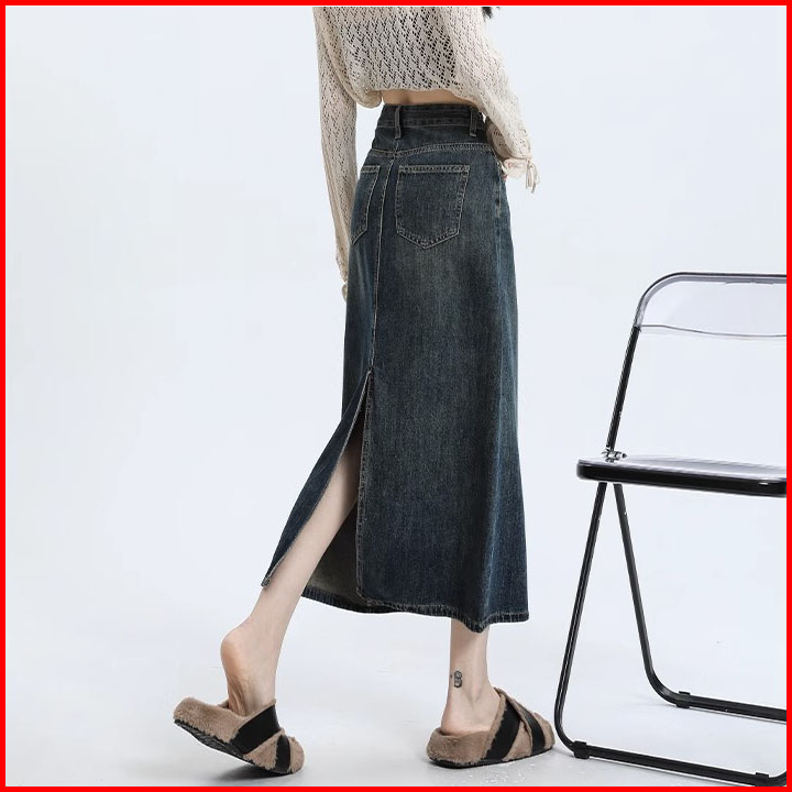 Penawaran Istimewa Rok Jeans Split Biru Retro Rok Midi A-line Highwaist Import