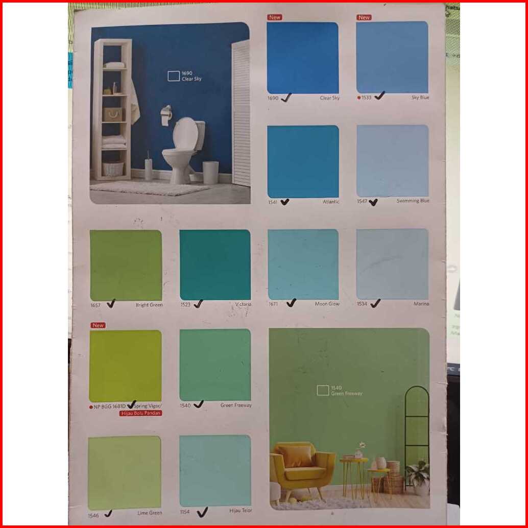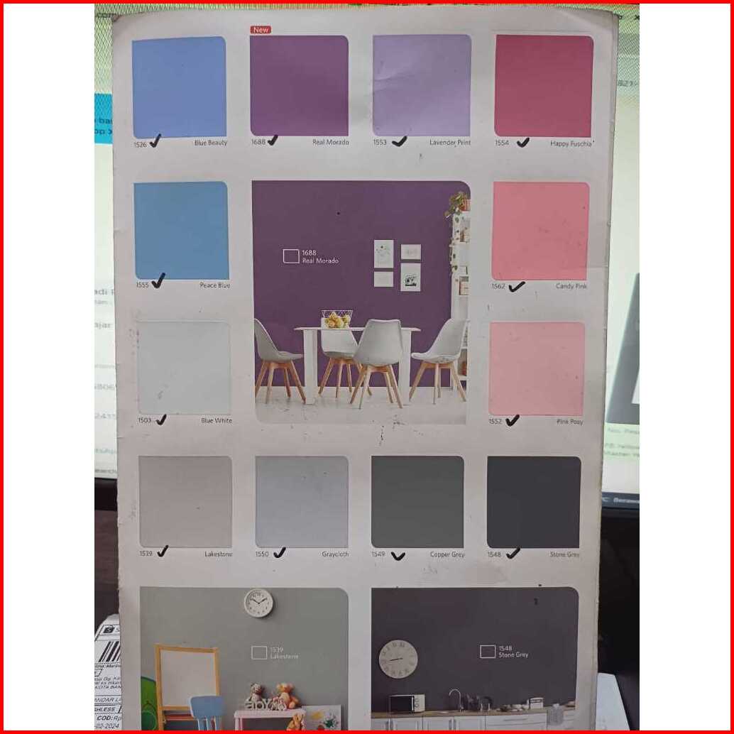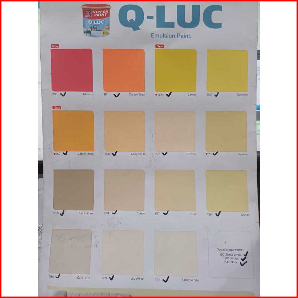 1501 Extra White, 1505 White, 1519 Black, 1185 Hibiscus, 1131 Orange Torch, 1684 Lemon, 1557 Sunshine, 1691 Golden Honey, 1531 Goby Sands, 1561 Chiffon, 1525 Jasmine, 1560 Sand Storm, 1518 Cream, 1117 Ivory, 1514 Durian, 1556 Cafe Latte, 1509 Lily White, 1515 Barley White, 1690 Clear Sky, 1533 Sky Blue, 1541 Atlantic, 1547 Swimming Blue, 1657 Bright Green, 1523 Victoria, 1671 Moon Glow, 1534 Marina, 1681D Spring Vigor, 1540 Green Freeway, 1546 Lime Green, 1154 Hijau Telor, 1526 Blue Beauty, 1688 Real Morado, 1553 Lavender Print, 1554 Happy Fuschia, 1555 Peace Blue, 1562 Candy Pink, 1503 Blue White, 1552 Pink Posy, 1539 Lakestone, 1550 Graycloth, 1549 Copper Grey, 1548 Stone Grey