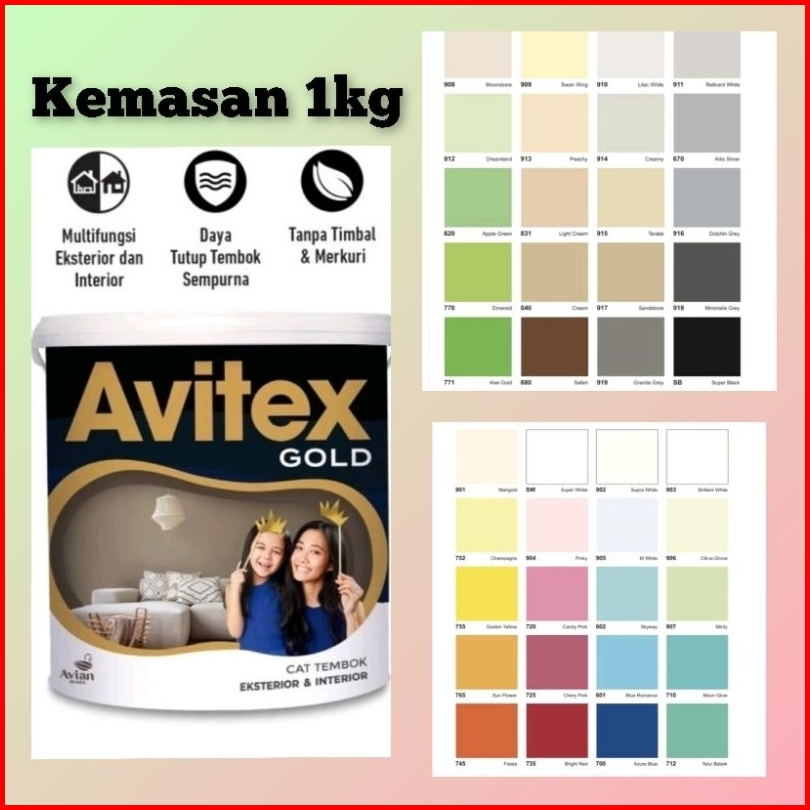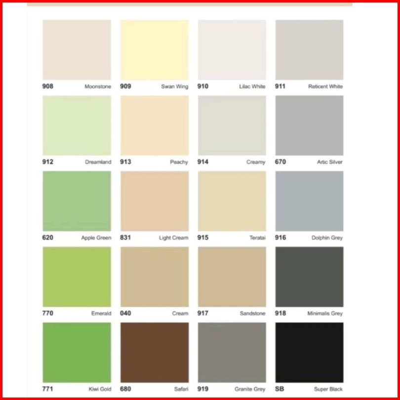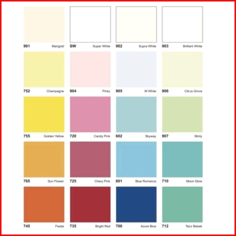901/marigold, Sw/super white, 902/Supra white, 903/briliant white, 752/champagne, 904/pinky, 905/m white, 906/Citrus grove, 755/golden yellow, 720/candy pink, 602/skyway, 907/minty, 765/sunflower, 725/Cherry pink, 601/blue romance, 710/moon glow, 745/fiesta, 735/bright red, 700/azure blue, 712/telur bebek, 908/moonstone, 909/swan wing, 910/Lilac white, 911/reticent white, 912/dreamland, 913/peachy, 914/creamy, 670/artic silver, 620/Apple green, 831/light cream, 915/teratai, 916/dolphine grey, 770/emerald, 040/cream, 917/sandstone, 918/minimalis grey, 771/kiwi gold, 680/safari, 919/granite grey, SB/super black, Hijau sage, Putih salju, Pink love, Ungu magic, Blewah, 736/red chili, Small wonder, Lavender honey, Purple nectar, Heaven door, Purple radiant, Rare gem, Crispy seaweed, Secret wonderland, Sky garden, Wonderful world, Purple spark, Self potrait, Dream come true, Cloud forest, Blushed willows, Beach gypsy, Pink pepper, R3-002 fairy dust, Creamy milkshake, Dry woodland