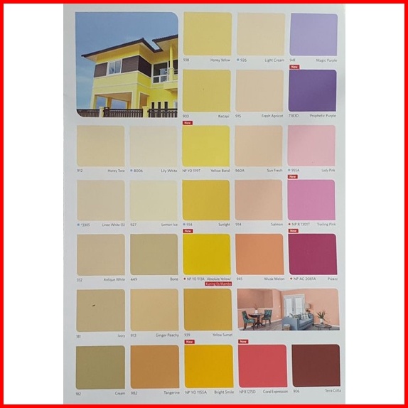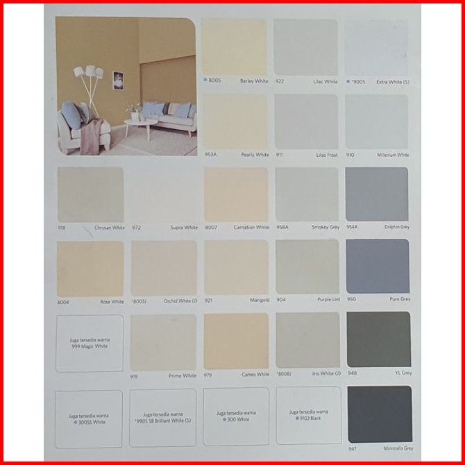 300 White, 900 Extra White, 330 Linen White, 8005 Barley White, 8006 Lily White, 972 Supra White, 919 Prime White, 918 Chrysant Whitr, 954A Dolphin Grey, 958A Smokey Grey, 948 YL Grey, 990 Brilliant White, 955 Lady Pink, 927 Lemon Ice, 910 Milenium W, 947 Minimalis Grey, 973 Blue White, 8008J Irish White, 953A Pearly White, 926 Light Cream, 922 Lilac White, 934 Sunlight, 945 Musk Melon, 9103 Black, 904 Purple Lint, 921 Marigold, 941 Magic Purple, 937 Artic Blue, 911 Lilac Frost, 1011P Soft Tissue, 1883 Saddle Brown, 8003J Orchid White, 1759 Sweet Escapade, 1010 Welden White, 1002P Snow White, 1083 Reticent White, 999 Magic White, 2147P Melted Cream
