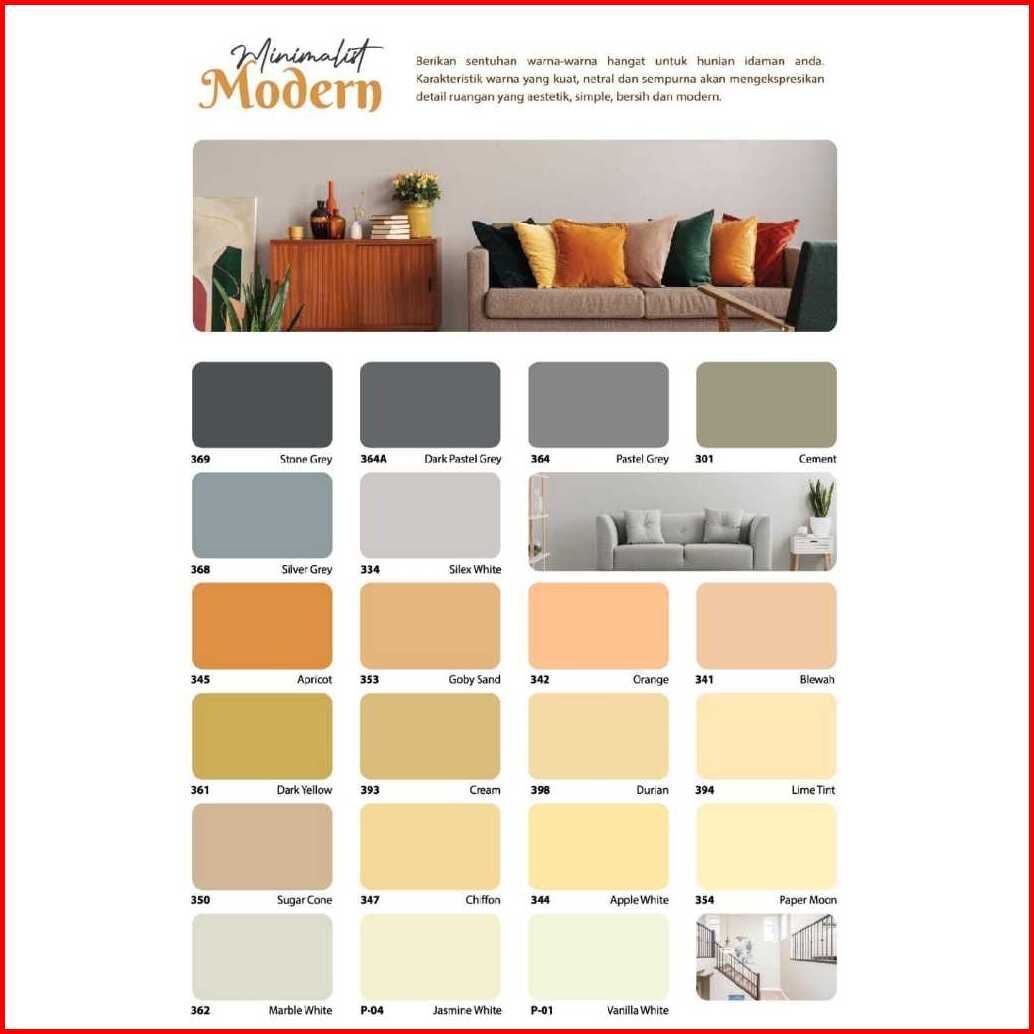 tile red, golden eye, ocean blue, dark pastel grey, chiffon, putih elite, hibiscus, misty green, banana yellow, ivory, durian, lemonade, lime tint, merlin blue, rose pink, golden yellow, silex white, hitam, light sky blue, green ice, putih, soft blue, sugar cone, apple white, cream, bright orange, putri metro, beauty fuschia, orange lady, paper moon, lavender violet, fire work, marble white, leaf green, suede, apricot, dark green, orange, AR blue, dark yellow, unique white, blewah, mint, pastel grey, sweet blue, hard green, dream land, barble doll, green peace, tropicana, luna red, goby sand, lime yellow, spring green, diva carrot, deep blue, silver grey, stone grey, cement, soft tea, putih deo, light rose pink