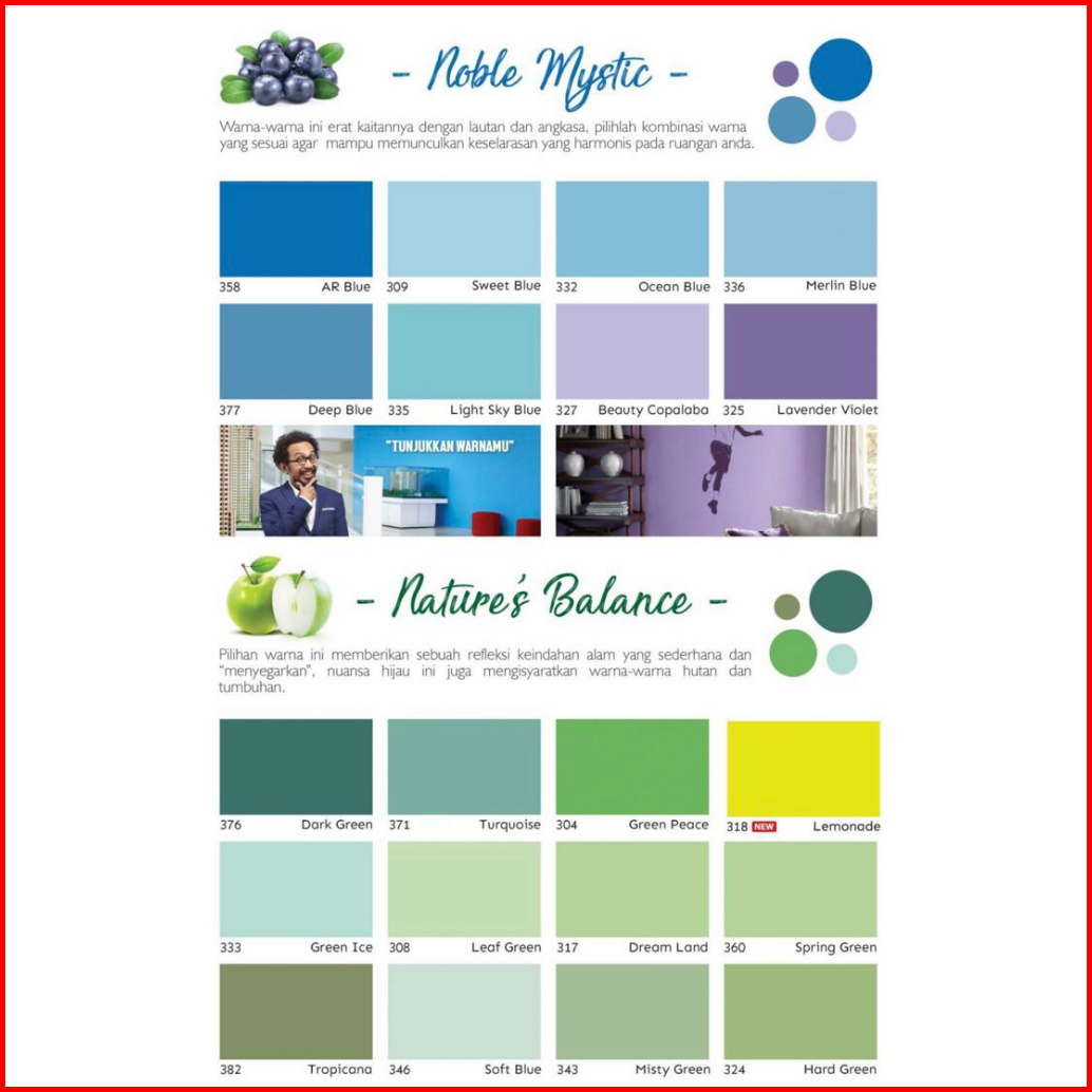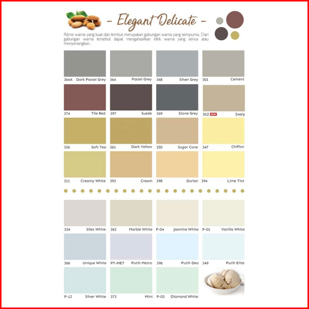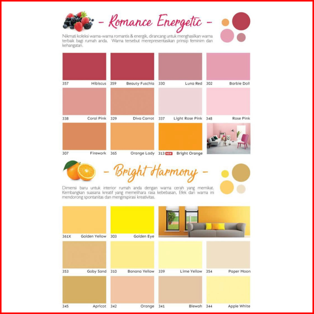 PUTIH 1KG, 357 HIBISCUS, 359 BEAUTY FUSCHIA, 330 LUNA RED, 302 BARBIE DOLL, 338 CORAL PINK, 329 DIVA CARROT, 337 LIGHT ROSE PINK, 348 ROSE PINK, 307 FIREWORK, 365 ORANGE LADY, 313 BRIGHT ORANGE, 361X GOLDEN YELLOW, 303 GOLDEN EYE, 353 GABY SAND, 310 BANANA YELLOW, 339 LIME YELLOW, 354 PAPER MOON, 345 APRICOT, 342 ORANGE, 341 BLEWAH, 344 APPLE WHITE, 358 BLUE AR, 309 SWEET BLUE, 332 OCEAN BLUE, 336 MERLIN BLUE, 377 DEEP BLUE, 335 LIGHT SKY BLUE, 327 BEAUTY COPALABA, 325 LAVENDER VIOLET, 376 DARK GREEN, 371 TURQUOISE, 304 GREEN PEACE, 318 LEMONADE, 333 GREEN ICE, 308 LEAF GREEN, 317 DREAM LAND, 360 SPRING GREEN, 382 TROPICANA, 346 SOFT BLUE, 343 MISTY GREEN, 324 HARD GREEN, 364A DARK PASTELGREY, 364 PASTEL GREY, 368 SILVER GREY, 301 CEMENT, 374 TILE RED, 397 SUEDE, 369 STONE GREY, P-01 VANILLA WHITE