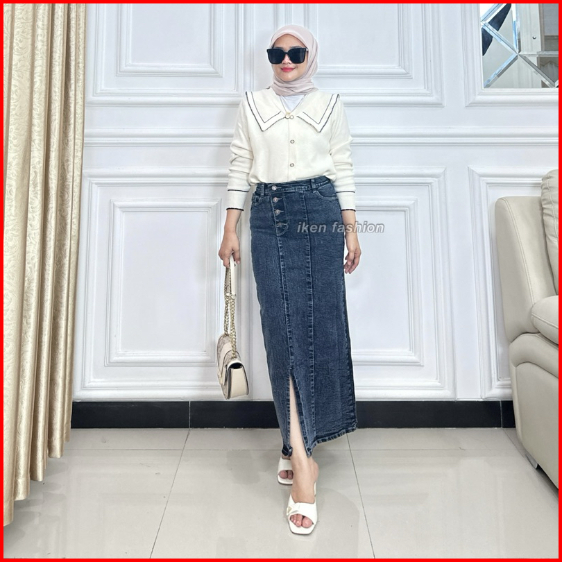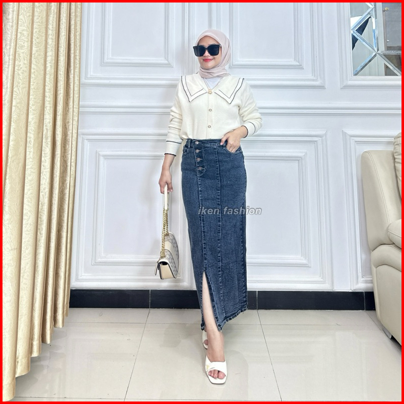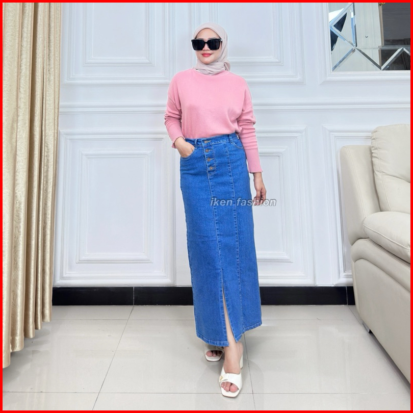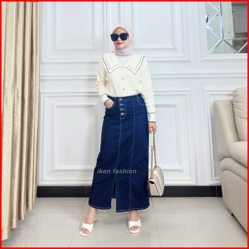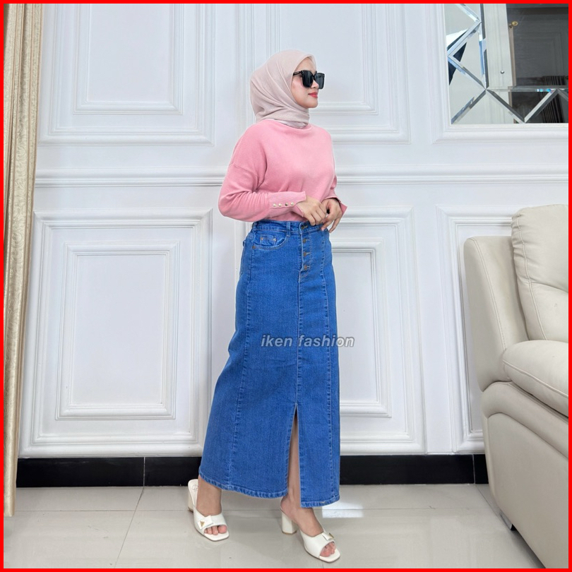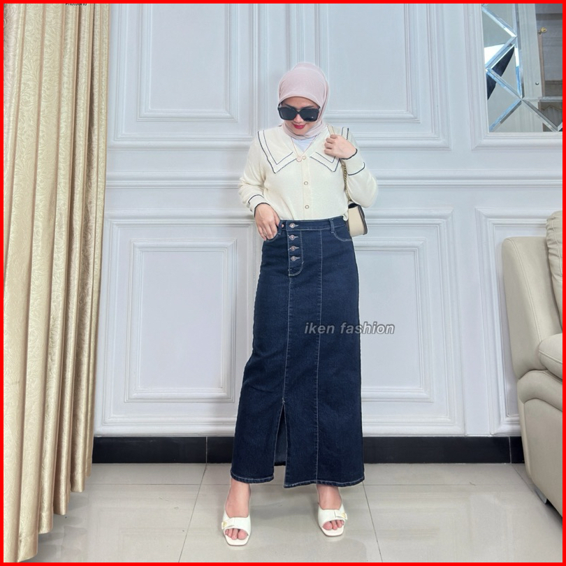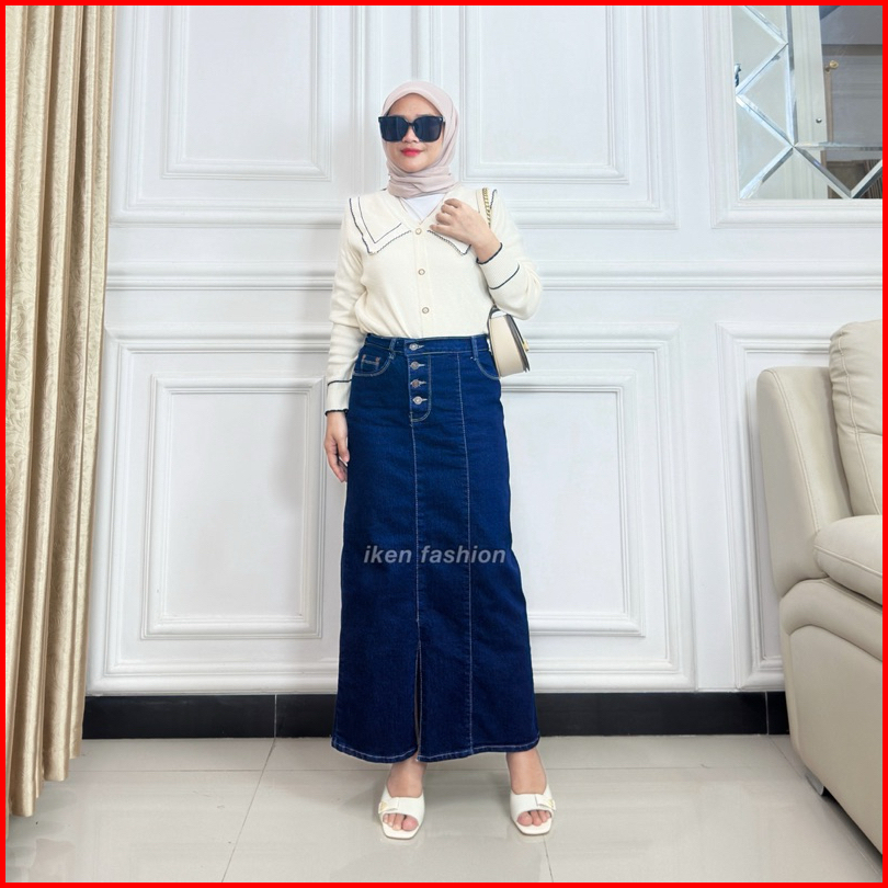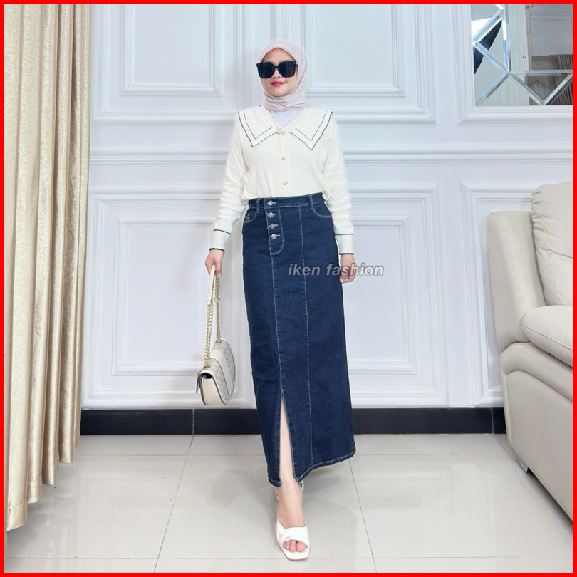 Long Doremi Skirt - Rok Jeans Panjang Wanita Stretch Premium - Rok Jeans Kekinian Semi A Line
