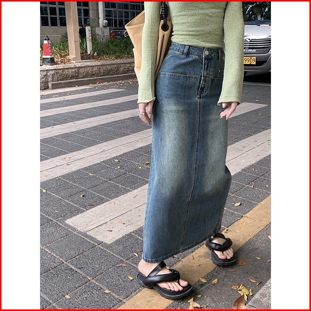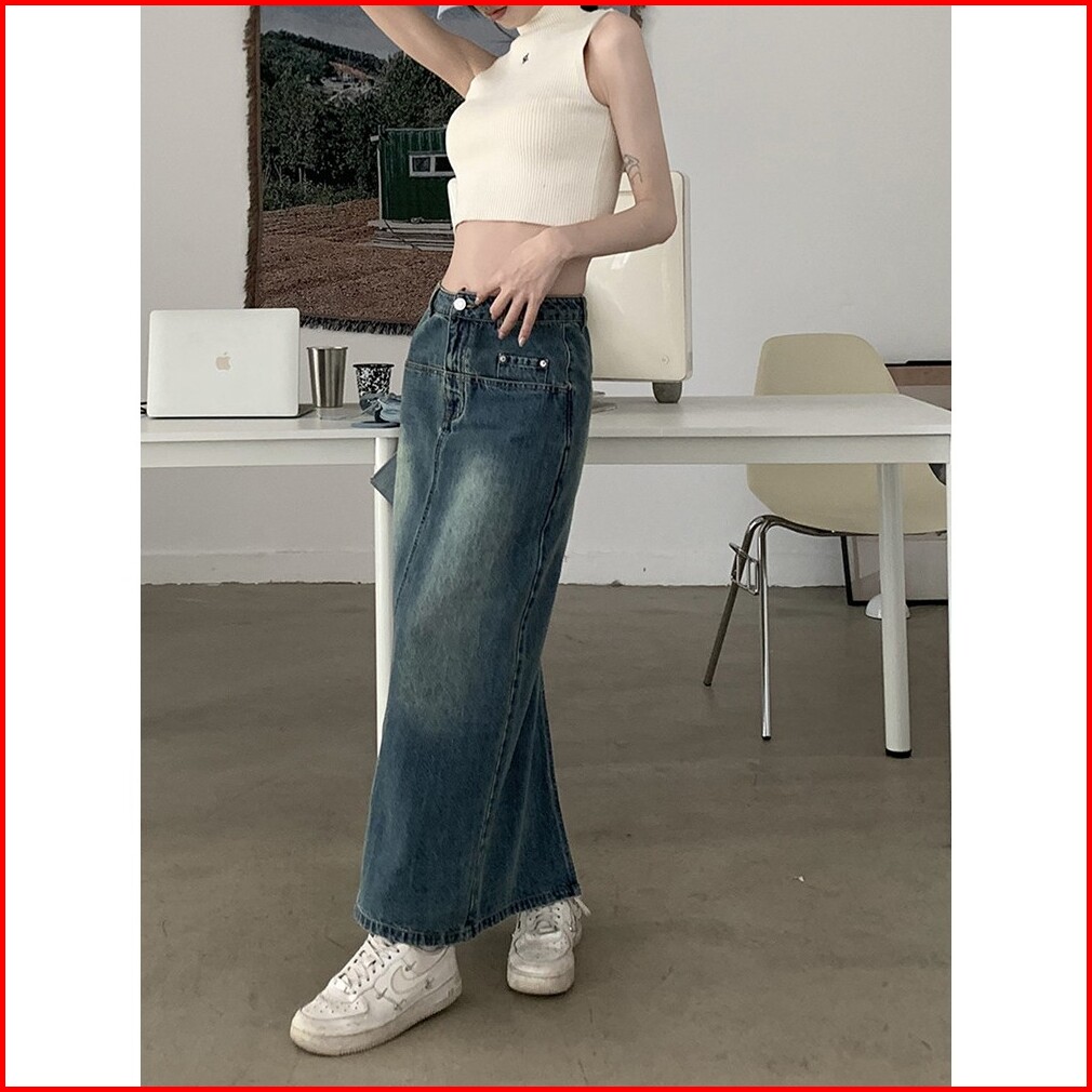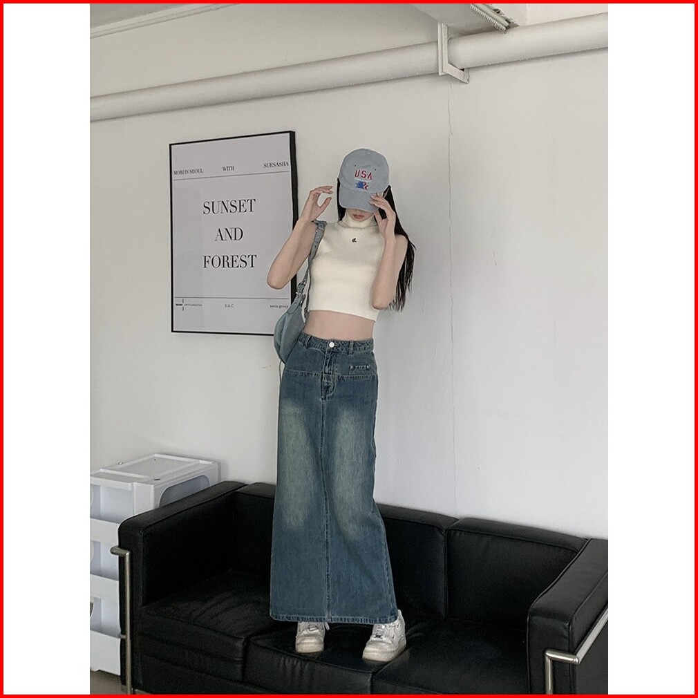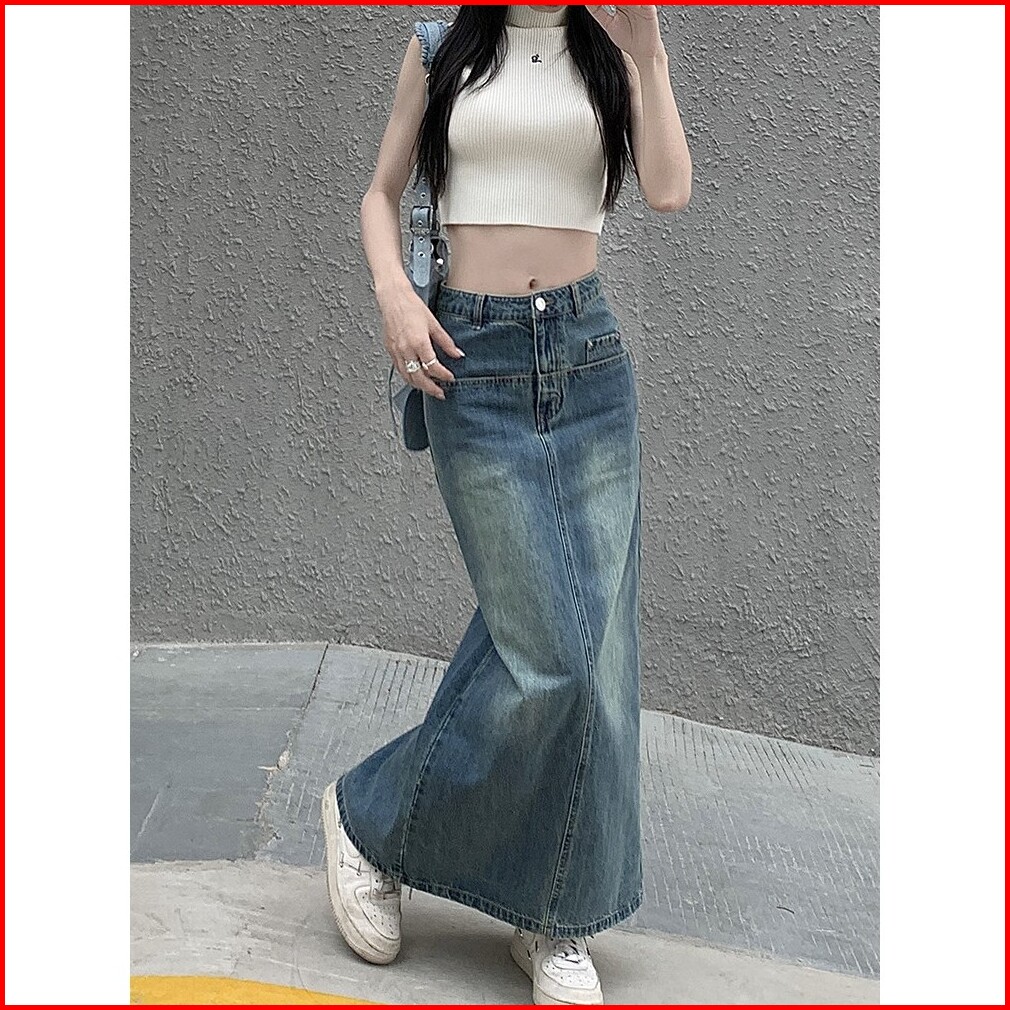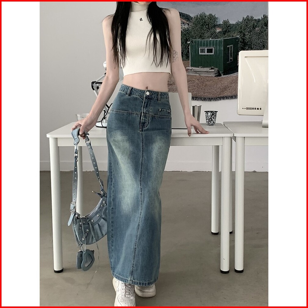 Desain Rok Denim A-line Biru Panjang Sedang Rok Denim Ramping Pinggang Tinggi Retro Yang Cocok Untuk Semua Wanita