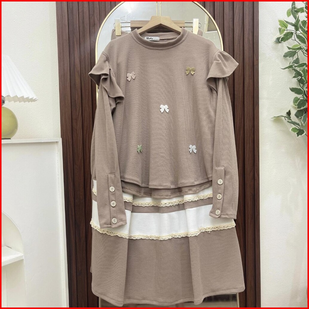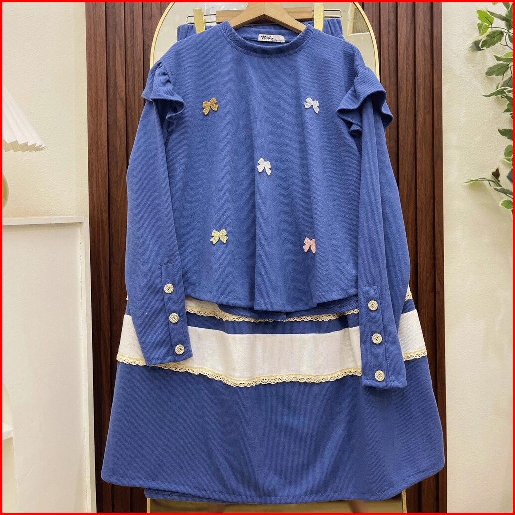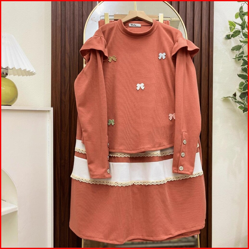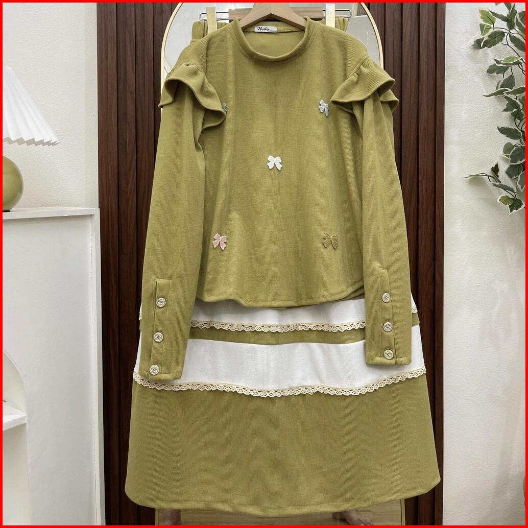 Setelan Rok Barbara Knit Wanita Dewasa One Set Fashion Terbaru Casual Dengan Pola Polos Dan Lengan Panjang - Kancing Nya