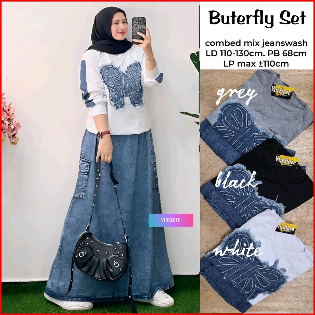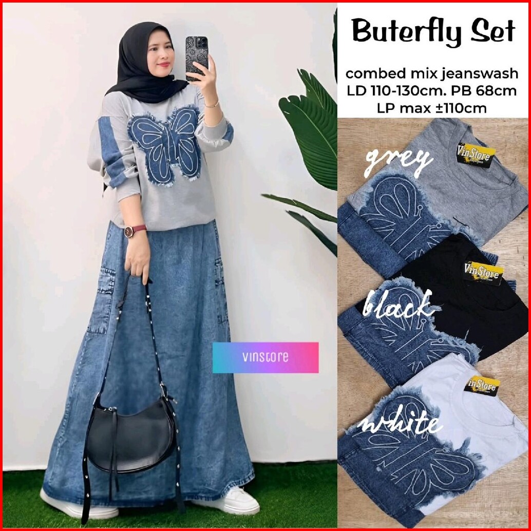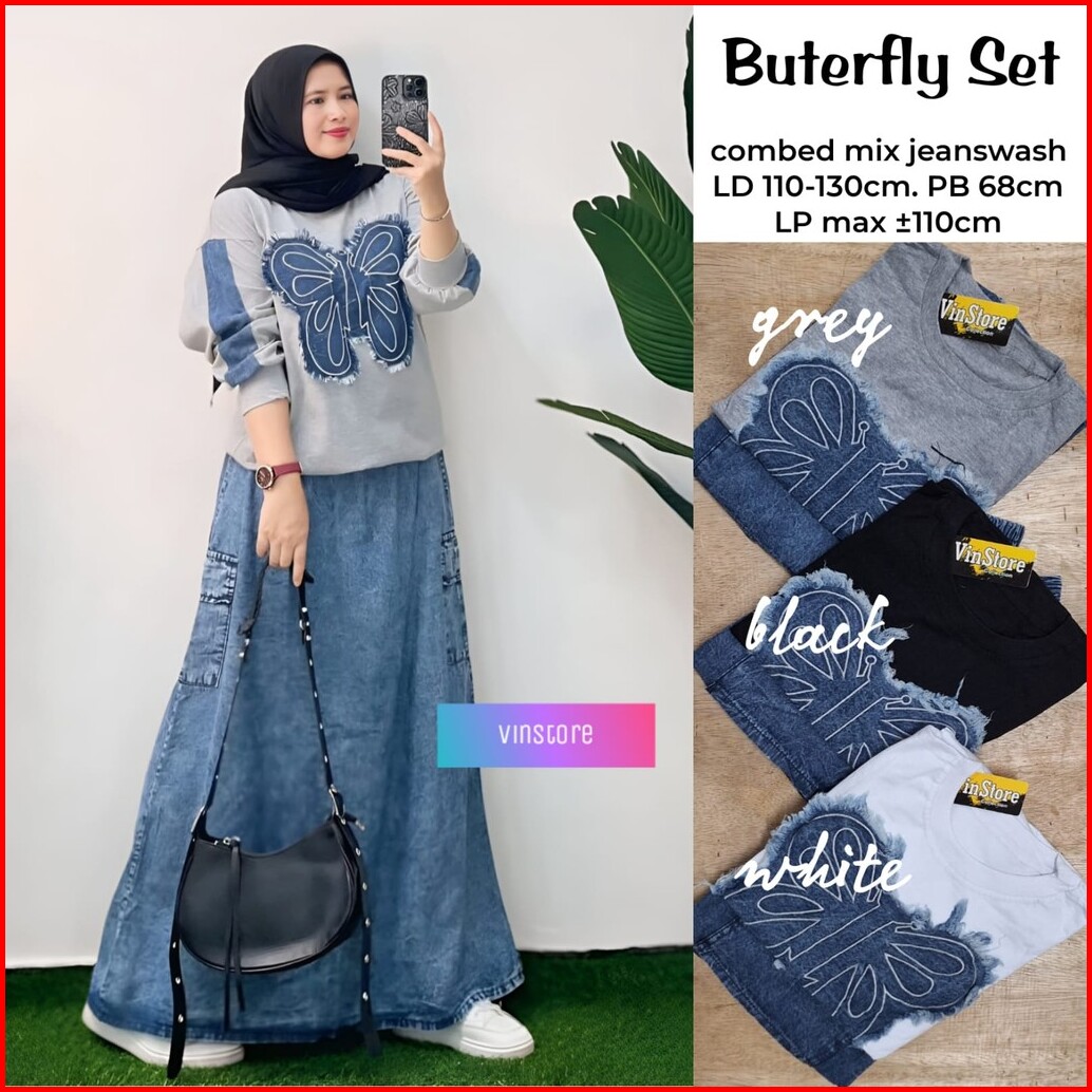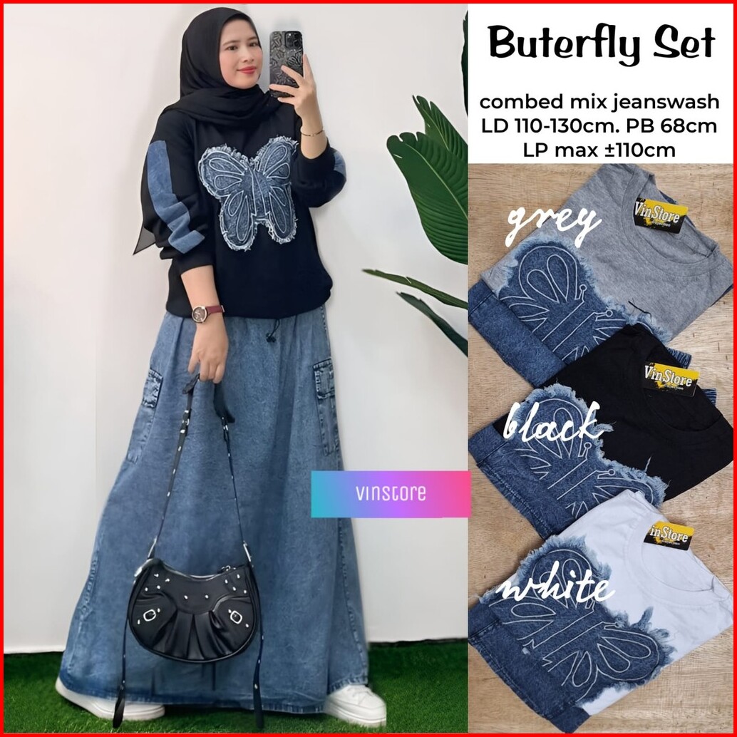 Ready Stok Siap Kirim Butterfly Set Original Vinstore Setelan Rok Kupu Kupu Jeans Wash Cargo Matt Combad Mix Jeans Wash
