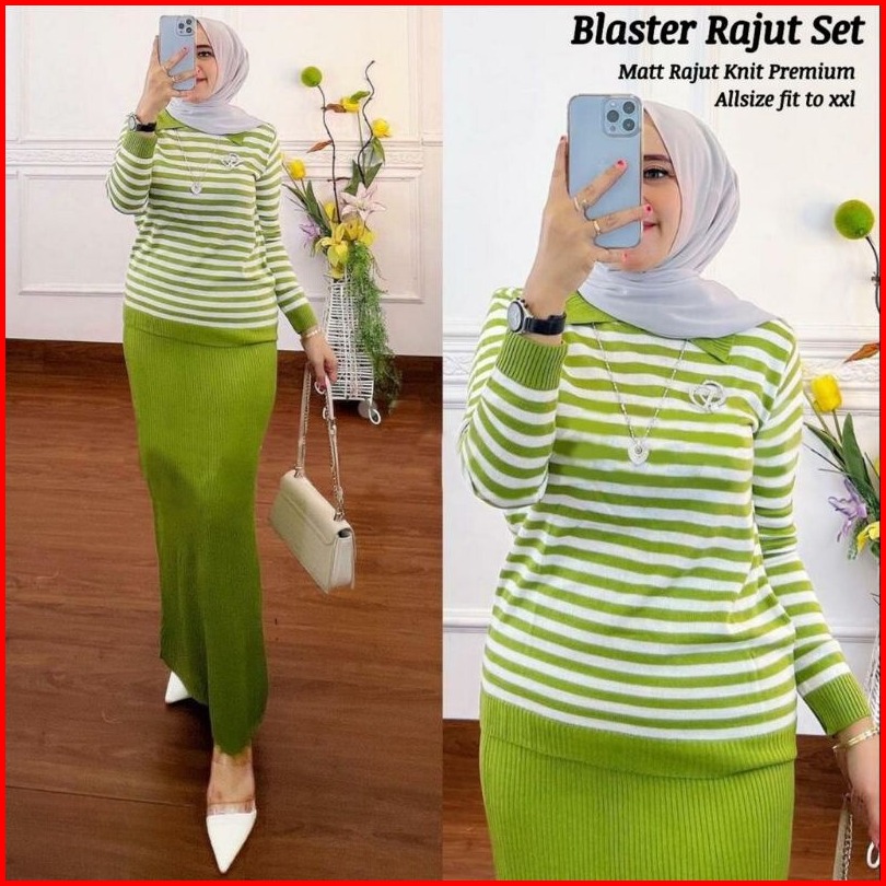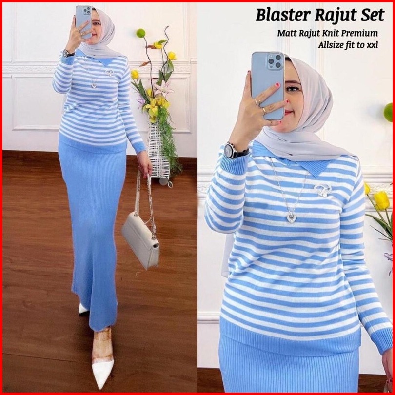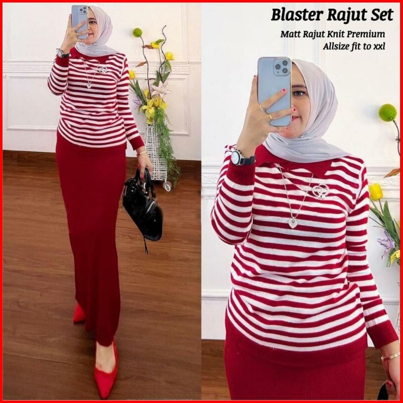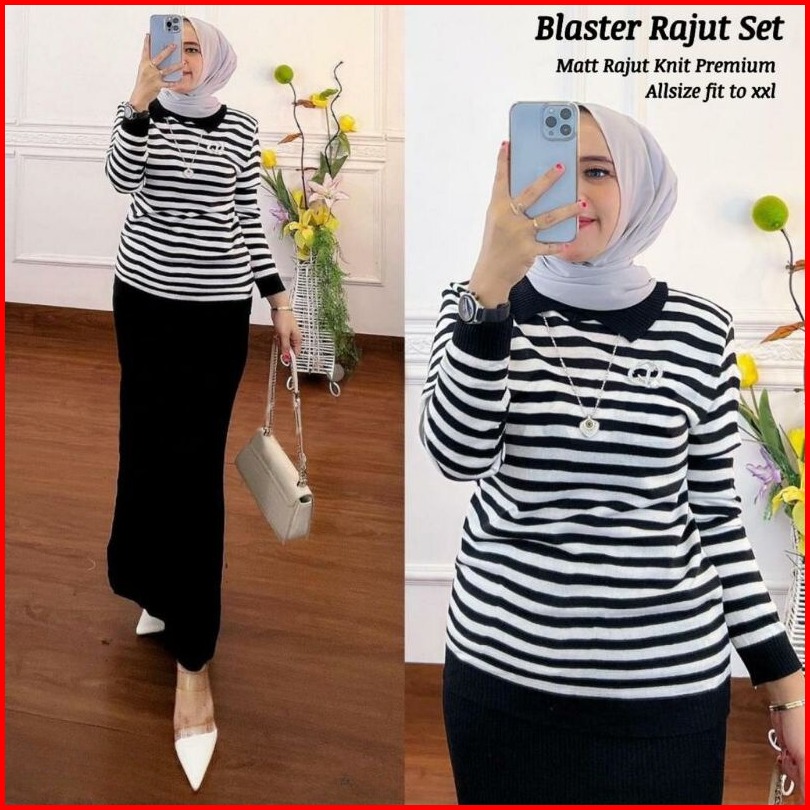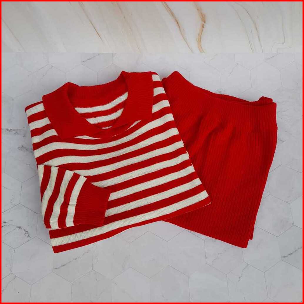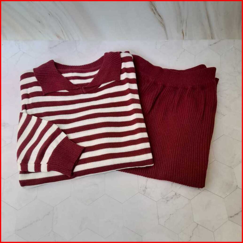 Maraya Knitwear Oneset Knit Atasan Kerah Motif Striped Rok Span - Setelan Rajut Wanita Tangan Panjang