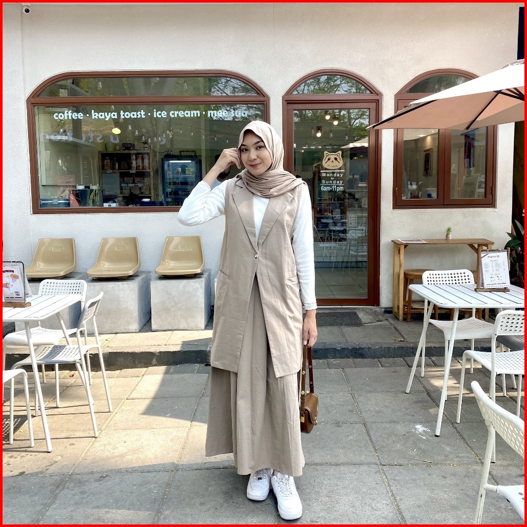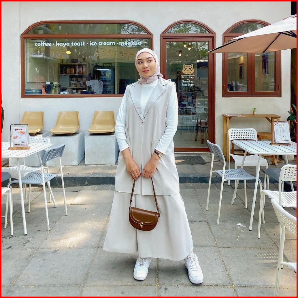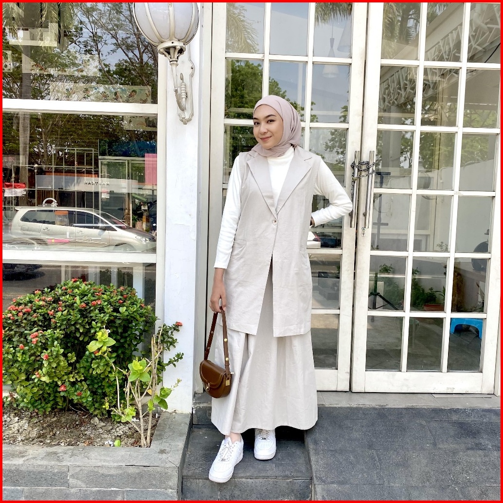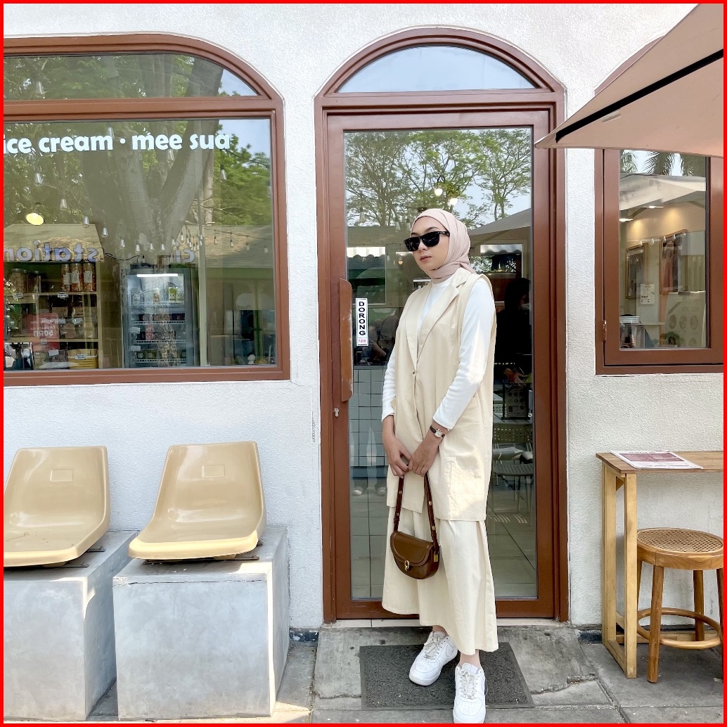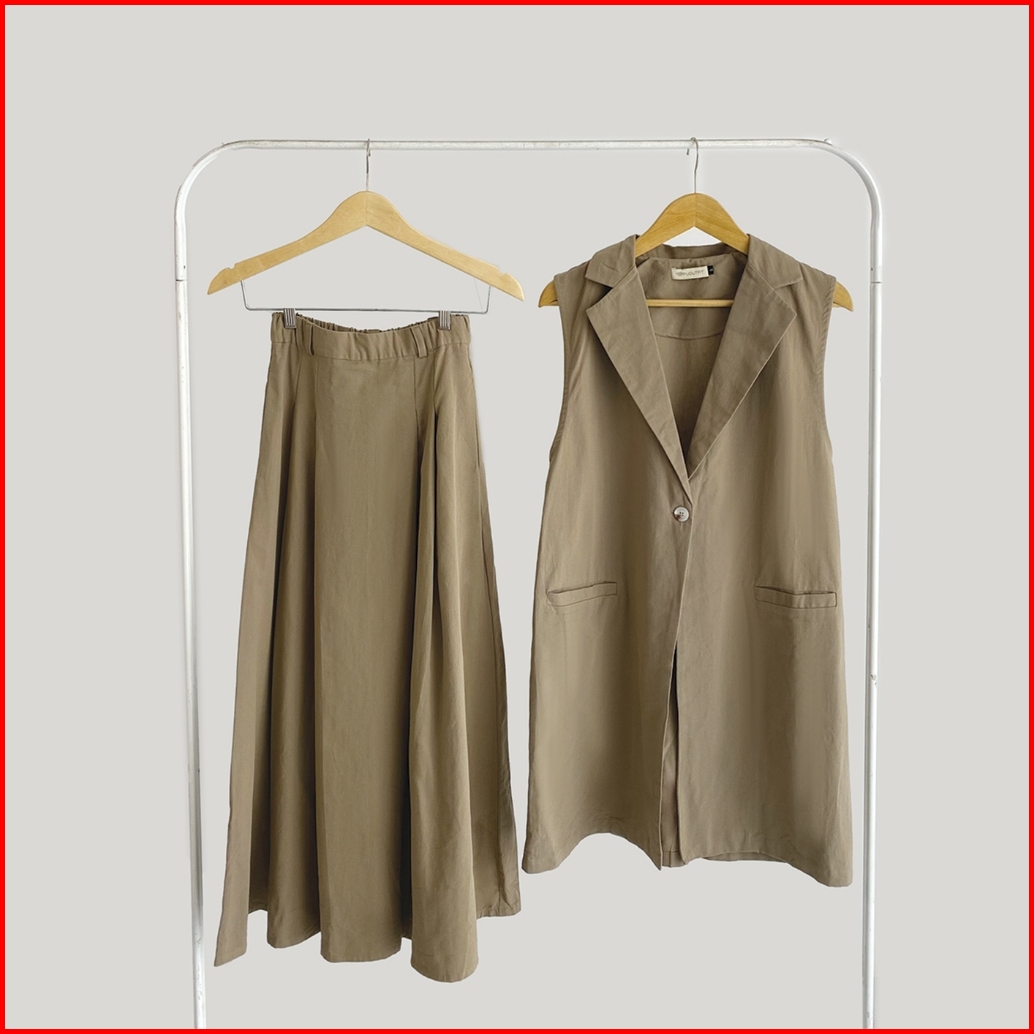 Yeppuoutfit - Helena One Set Setelan Vest Semi Blazer Tanpa Lengan Dan Rok Kerut Casual Wanita