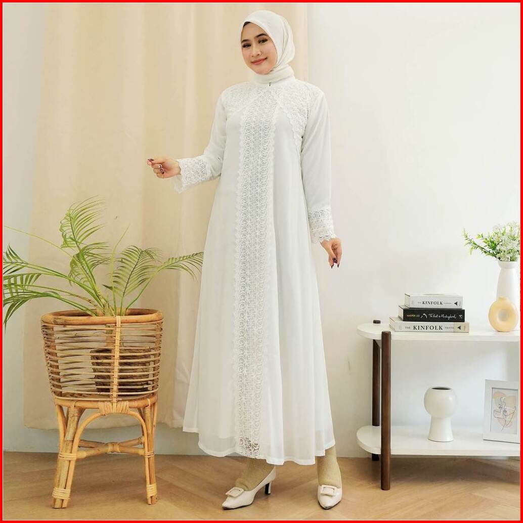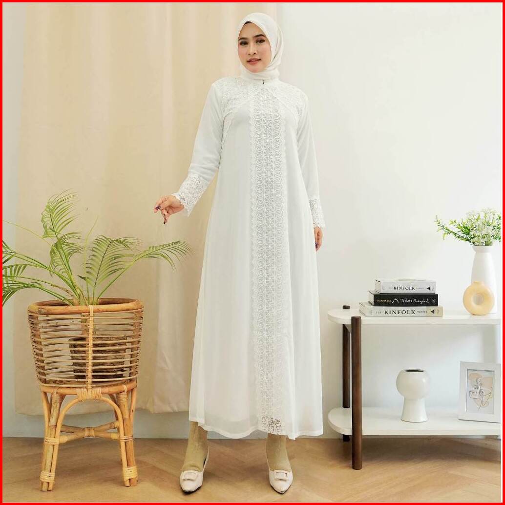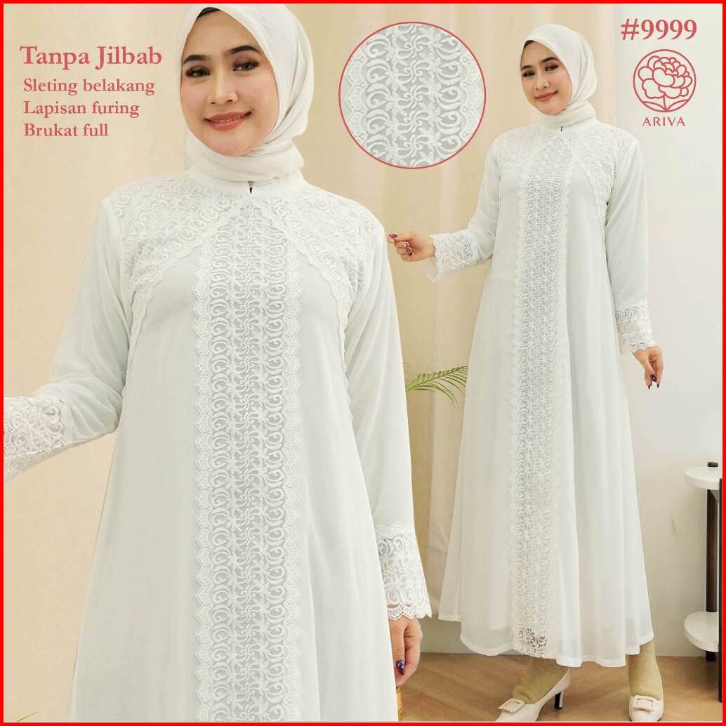 Gamis Raline 9999 Brukat Putih Muslim - Gamis Wanita Premium Lace Gamis Lebaran Umroh By Ariva