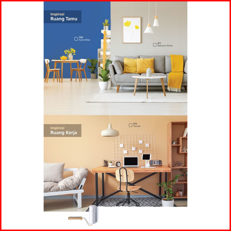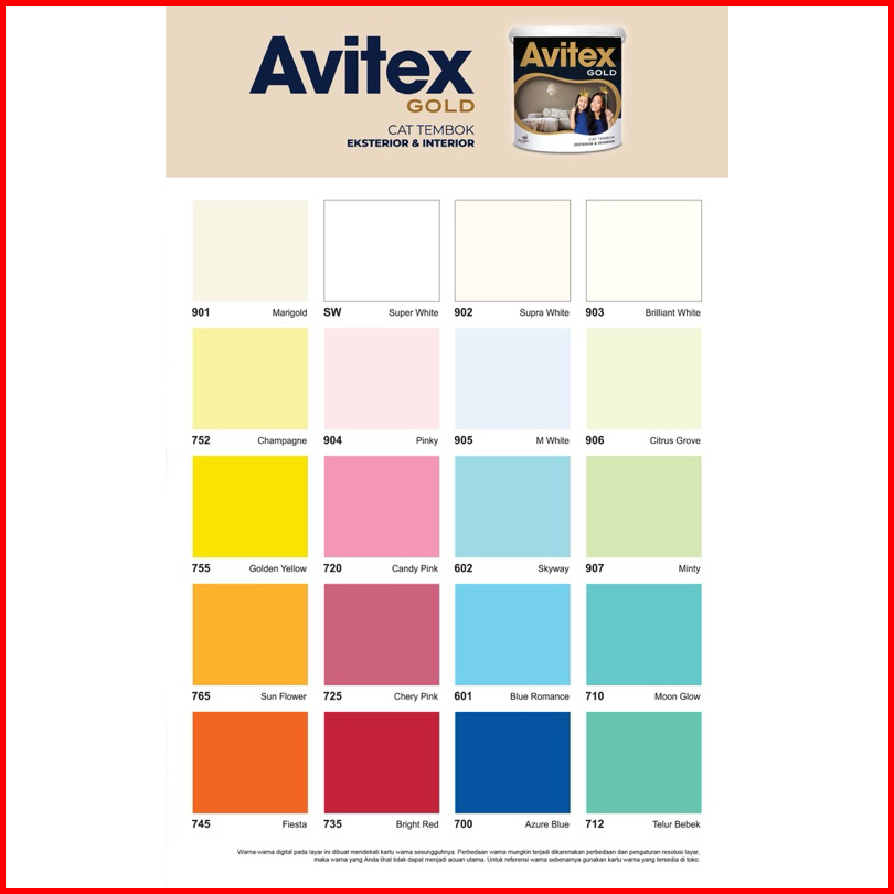 904 Pinky, 720 Candy Pink, 725 Chery Pink, 905 M White, 602 Sky Way, 601 Blue Romance, 700 Azura Blue, 901 Marigold, SW Super White, 902 Supra White, 903 Briliant White, 752 Compagne, 755 Golden Yellow, 765 Sun Flower, 745 Fiesta, 735 Bright Red, 906 Citrus Grove, 907 Mint, 710 Moon Glow, 712 Telur Bebek, 908 Moon Stone, 909 Swaan Wing, 910 Lilac White, 911 Reticent White, 912 Dreamland, 913 Peachy, 914 Creamy, 670 Artic Silver, 620 Apple Green, 831 Light Cream, 915 Teratai, 916 Dolphin Grey, 770 Emerlad, 771 Kiwi Gold, 040 Cream, 917 Sandstone, 918 Minimalis Grey, 680 Safari, 919 Granite grey, SB Super black, 736 Red Chili, Putih Base B, Putih Base A