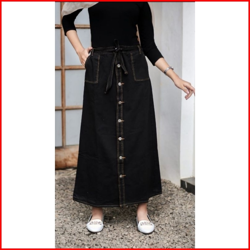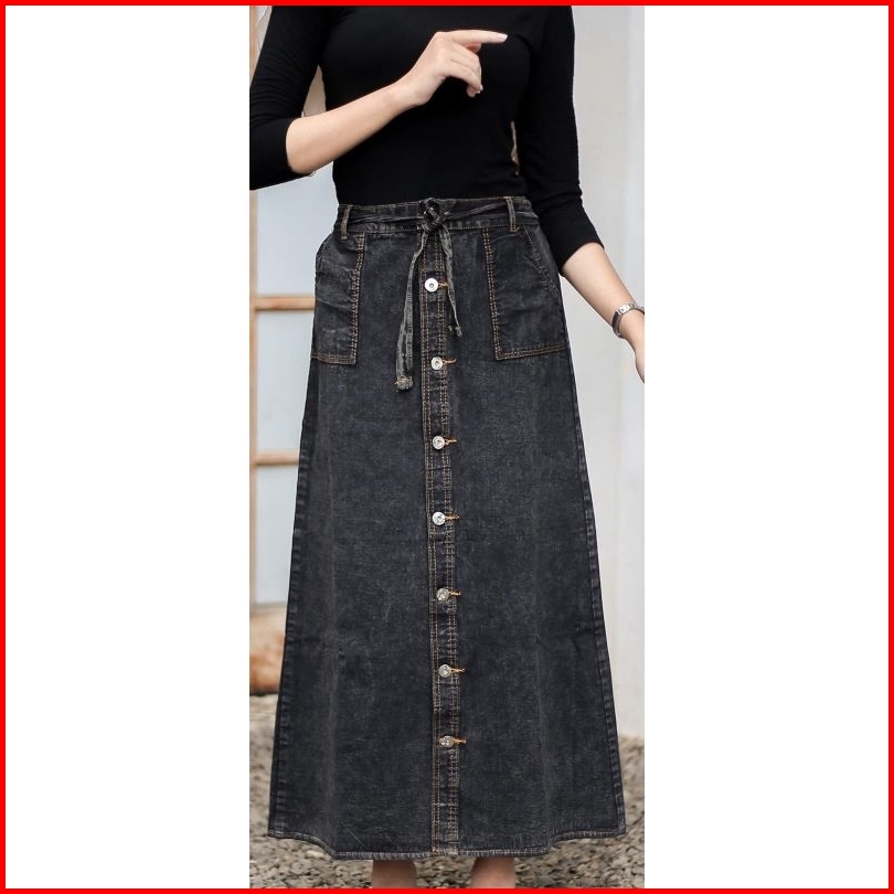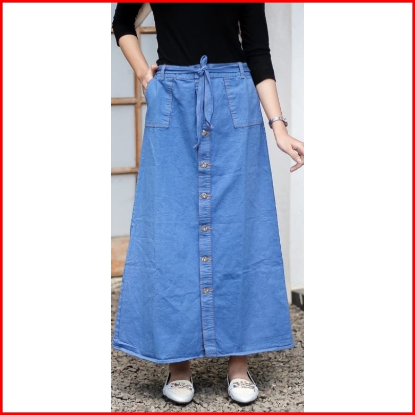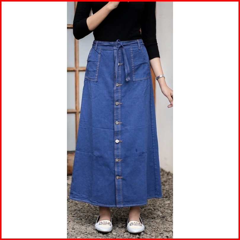 Rok Jeans Panjang Kancing Depan Tali Pinggang