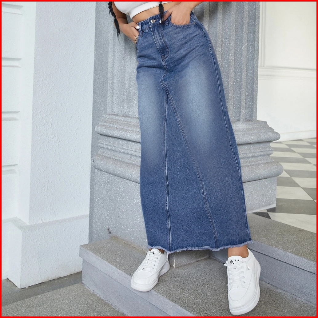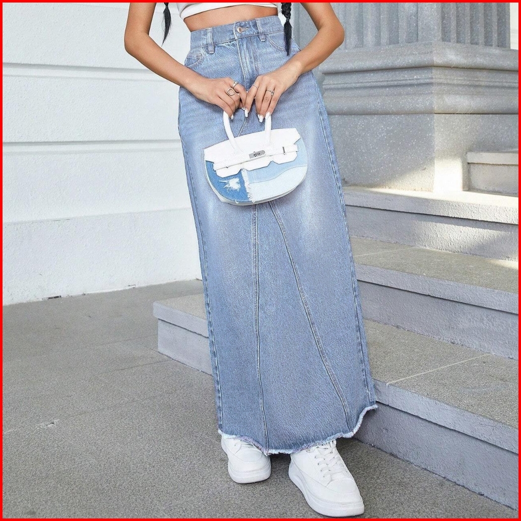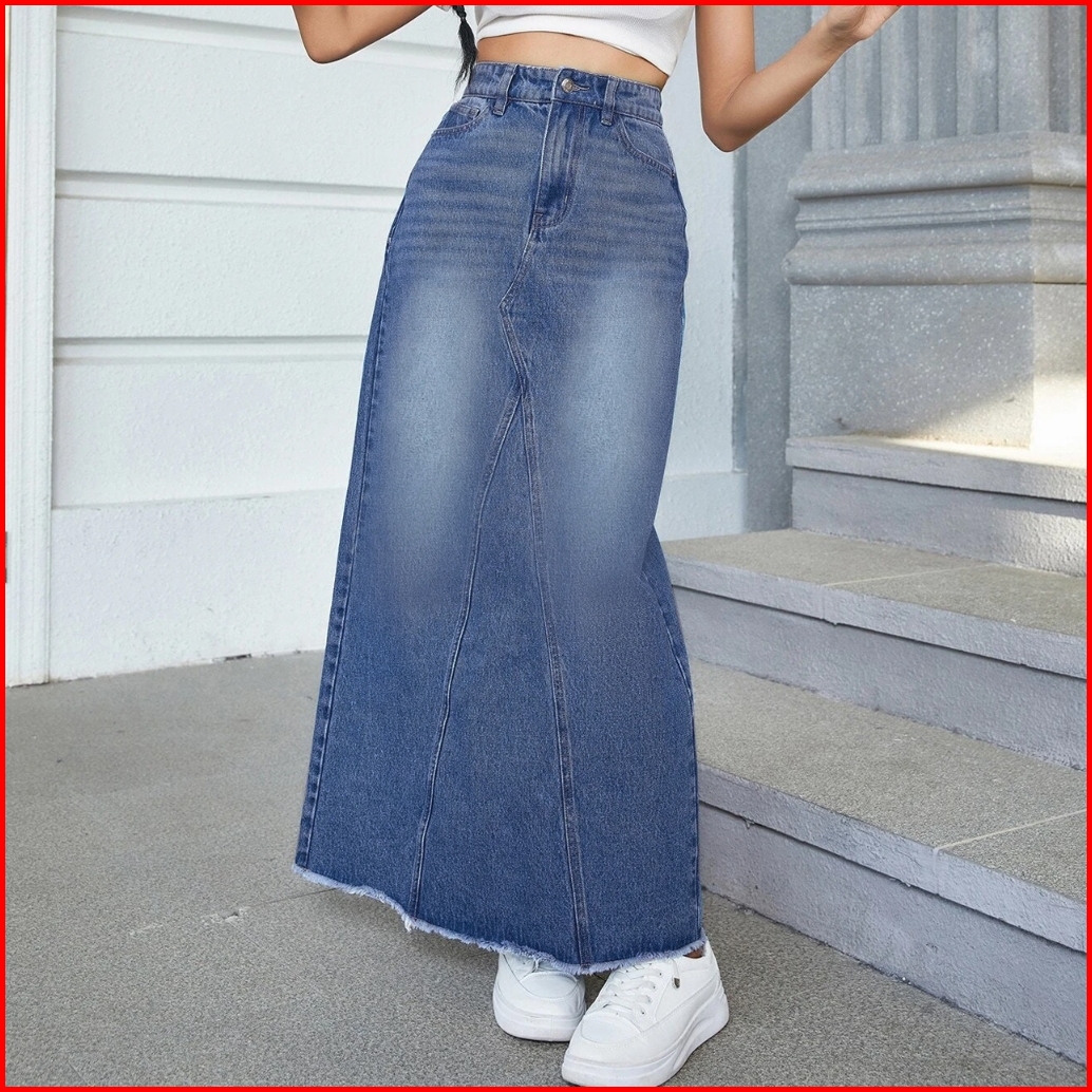 Long Denim Skirts For Women Korean Style Stylish Pockets Trend Rok Skirt
