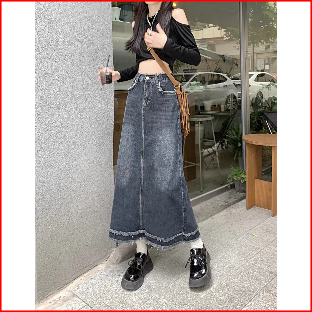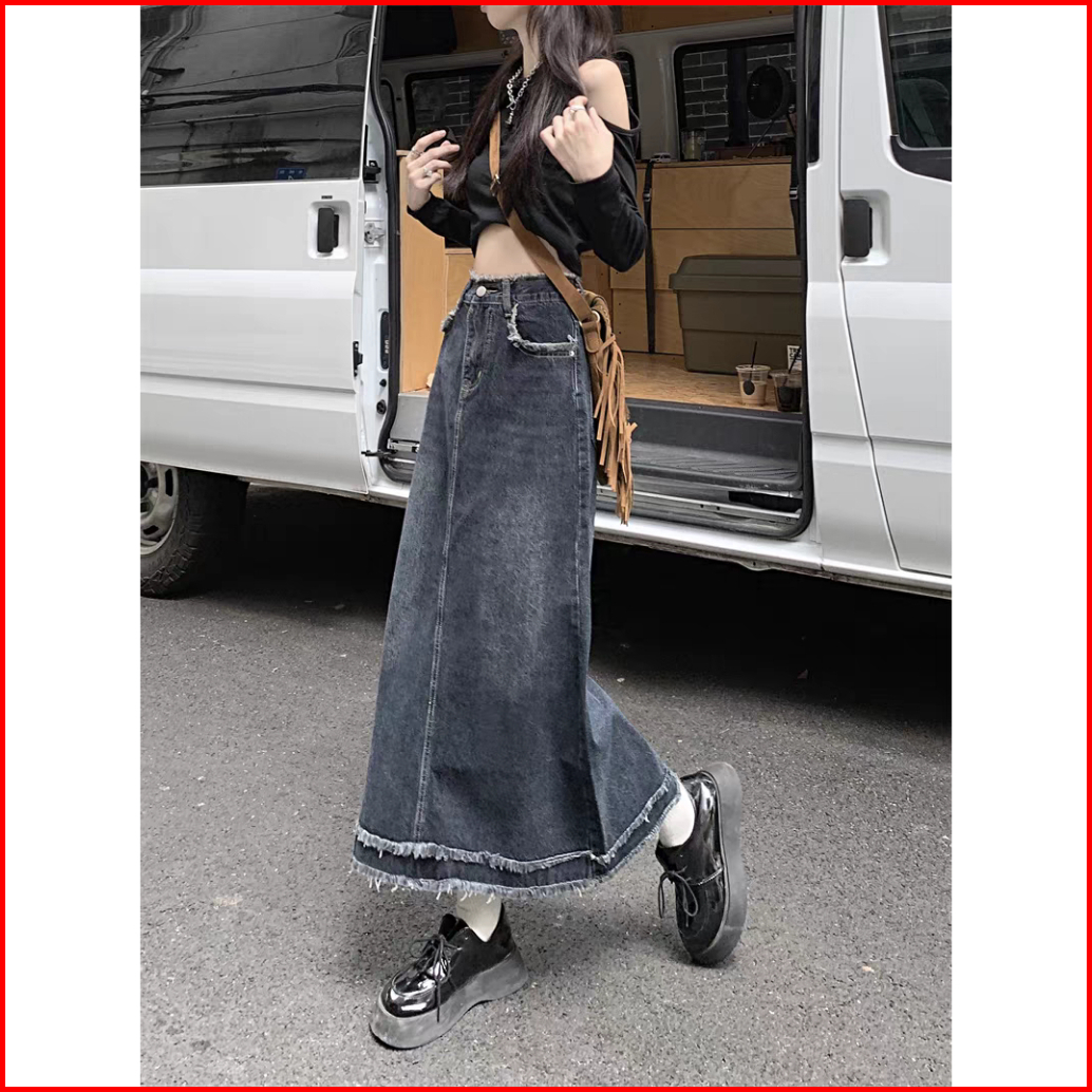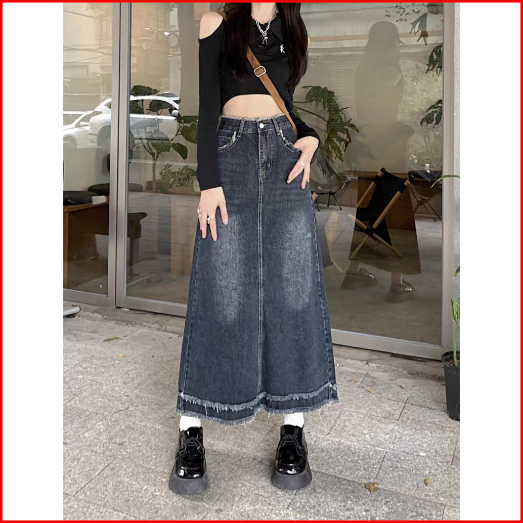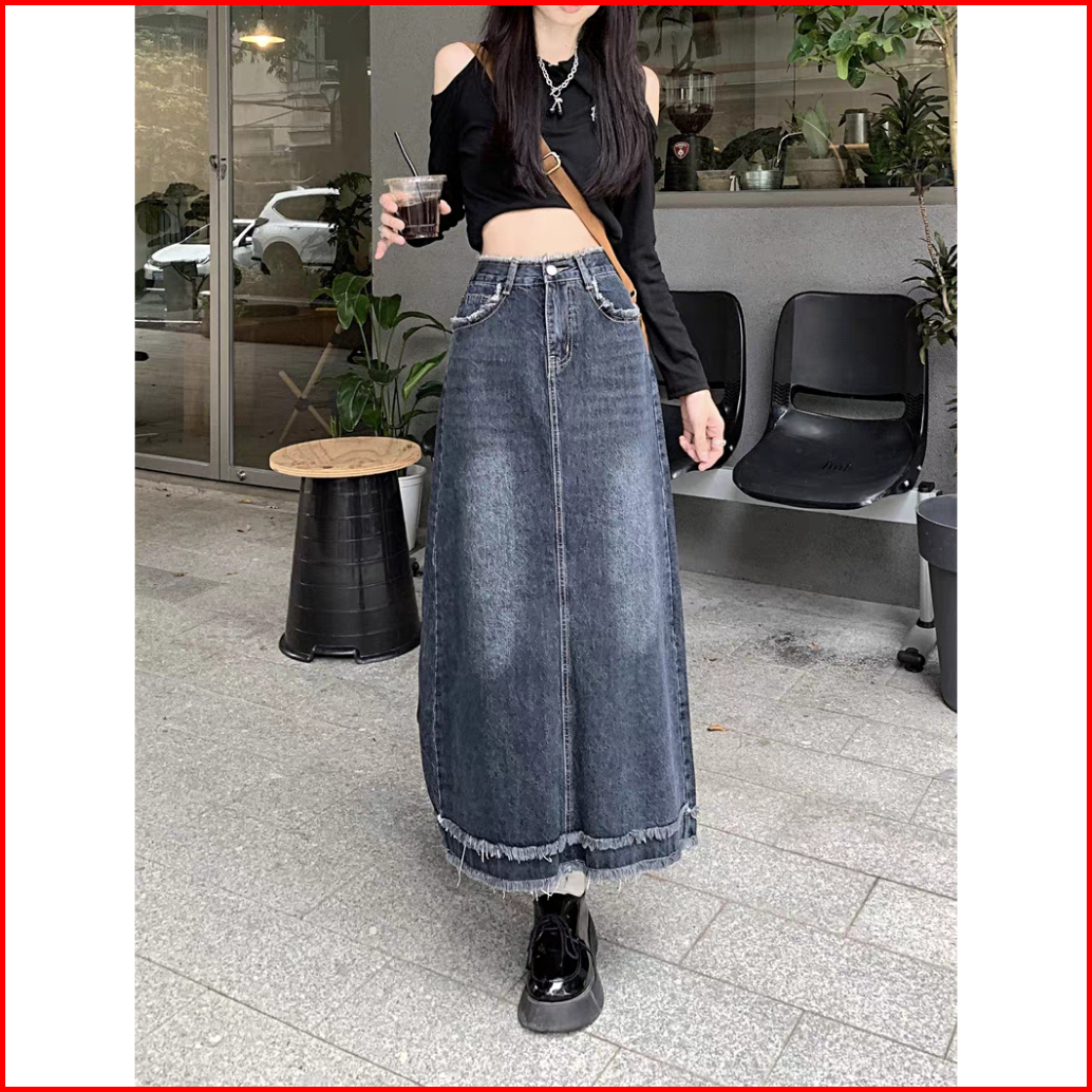Rok Denim Panjang Wanita Washed High Waist A-line Rok Korean Style Fashion