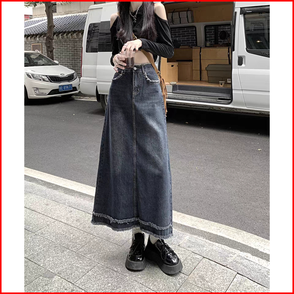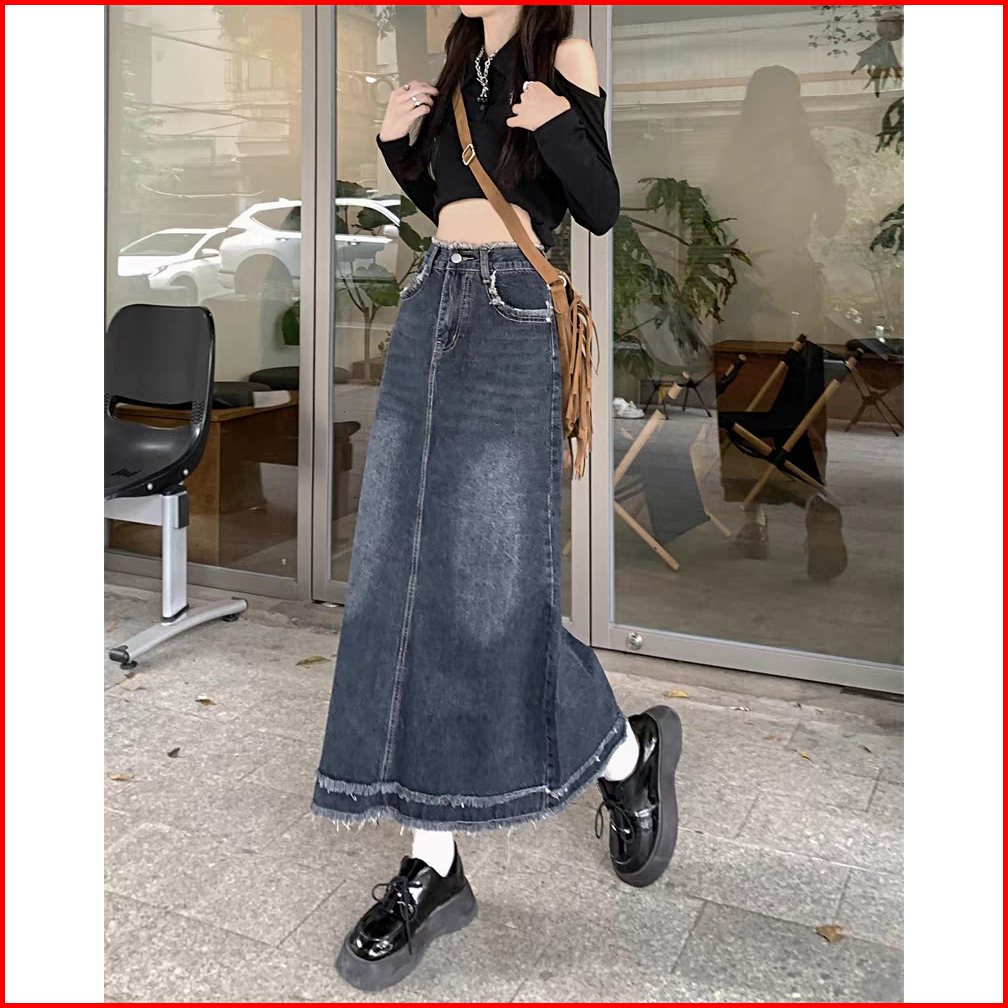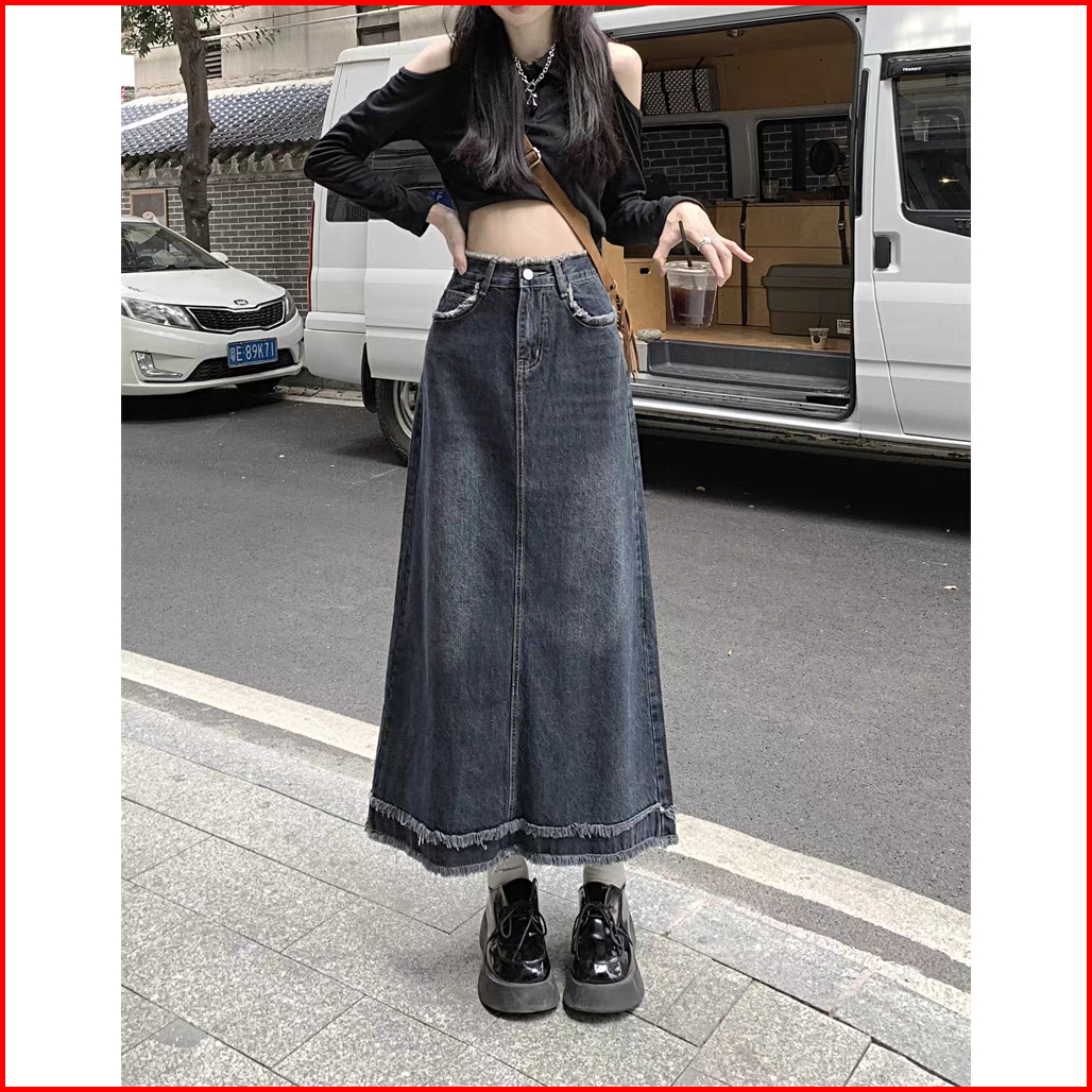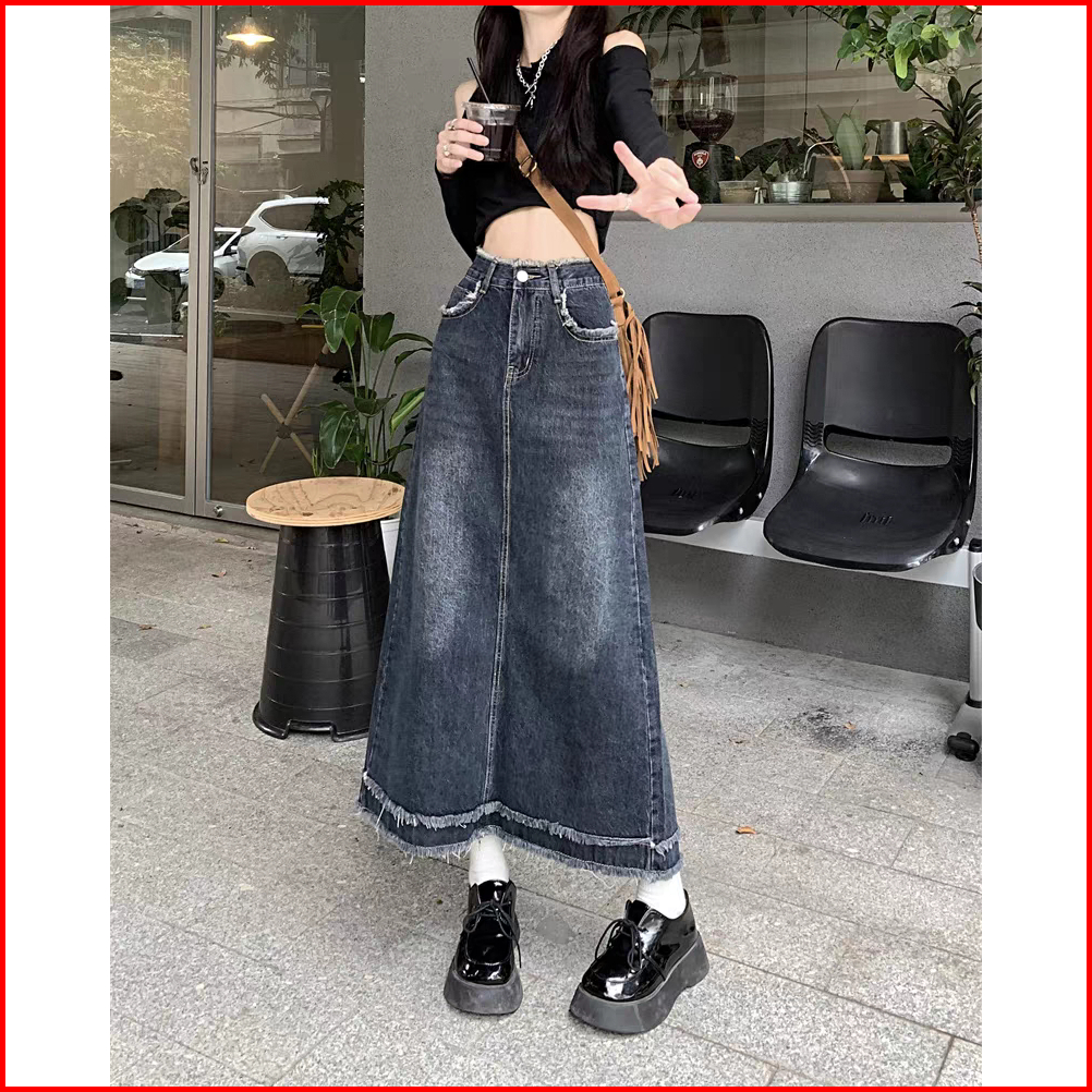 Rok Denim Panjang Wanita Washed High Waist A-line Rok Korean Style Fashion