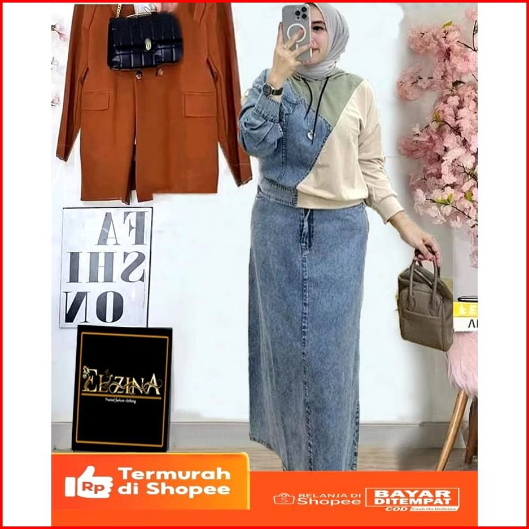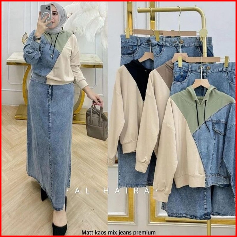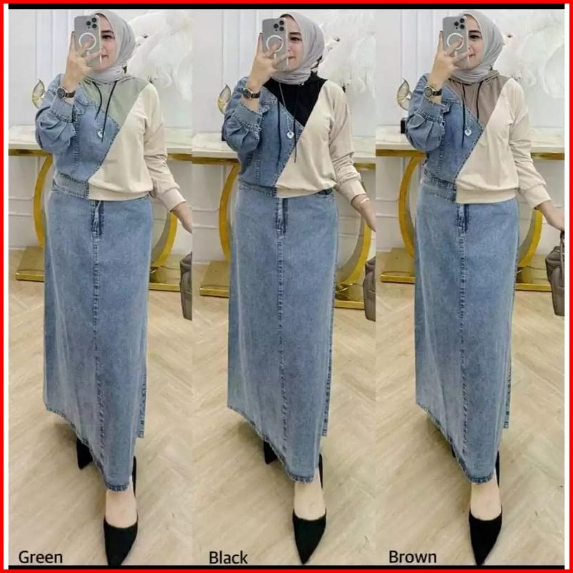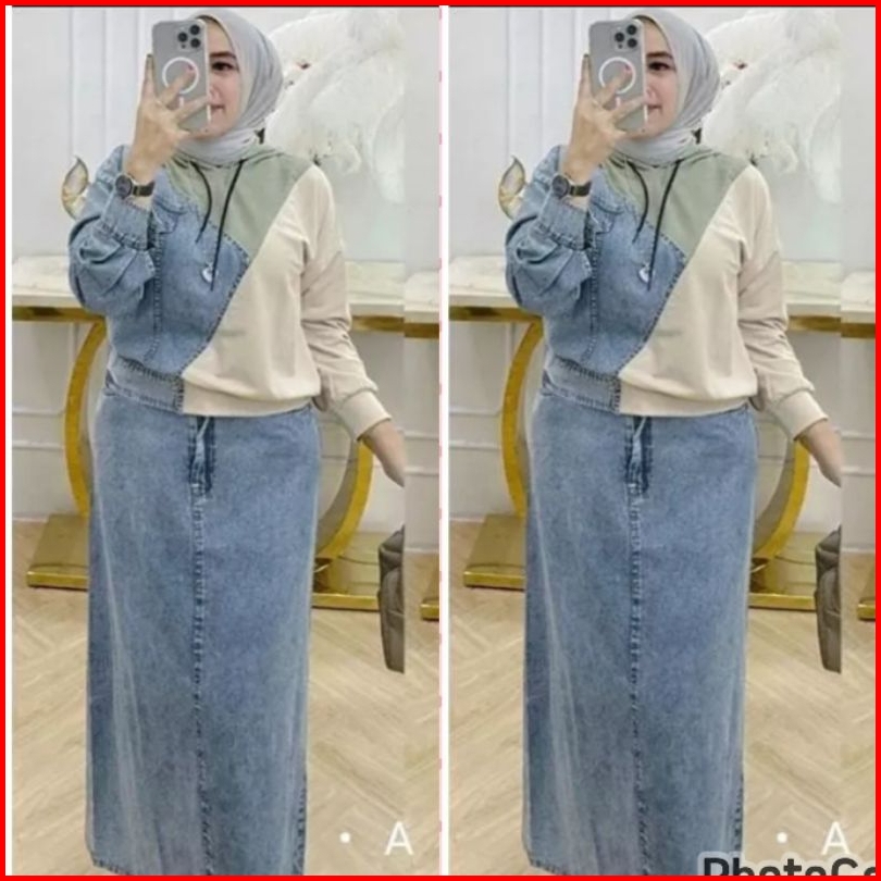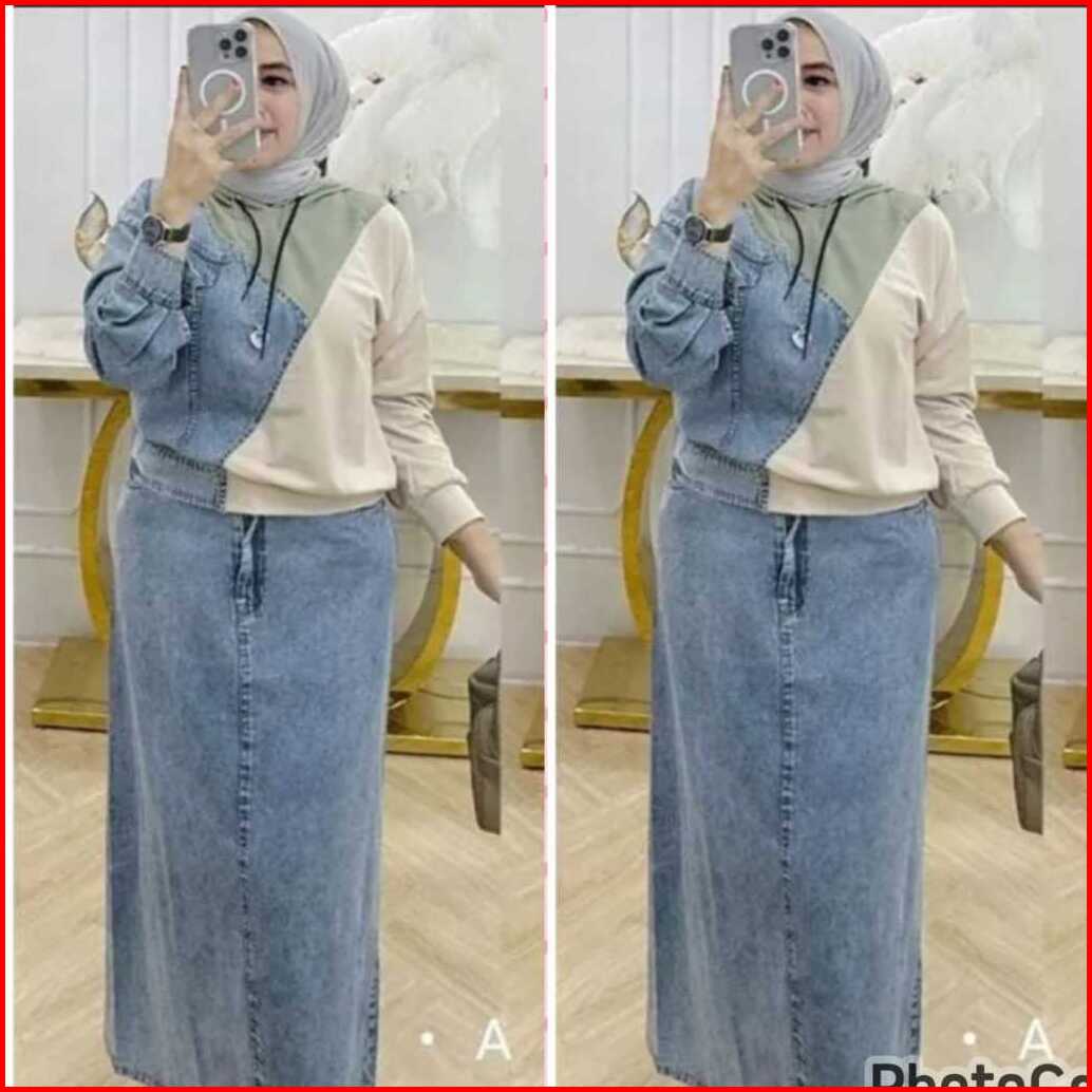 Promo Stelan One Set Mewah Alnami Set Rok Mat Knith Mix Jeans Stelan Atasan Rok Viral Jumbo L -xxl