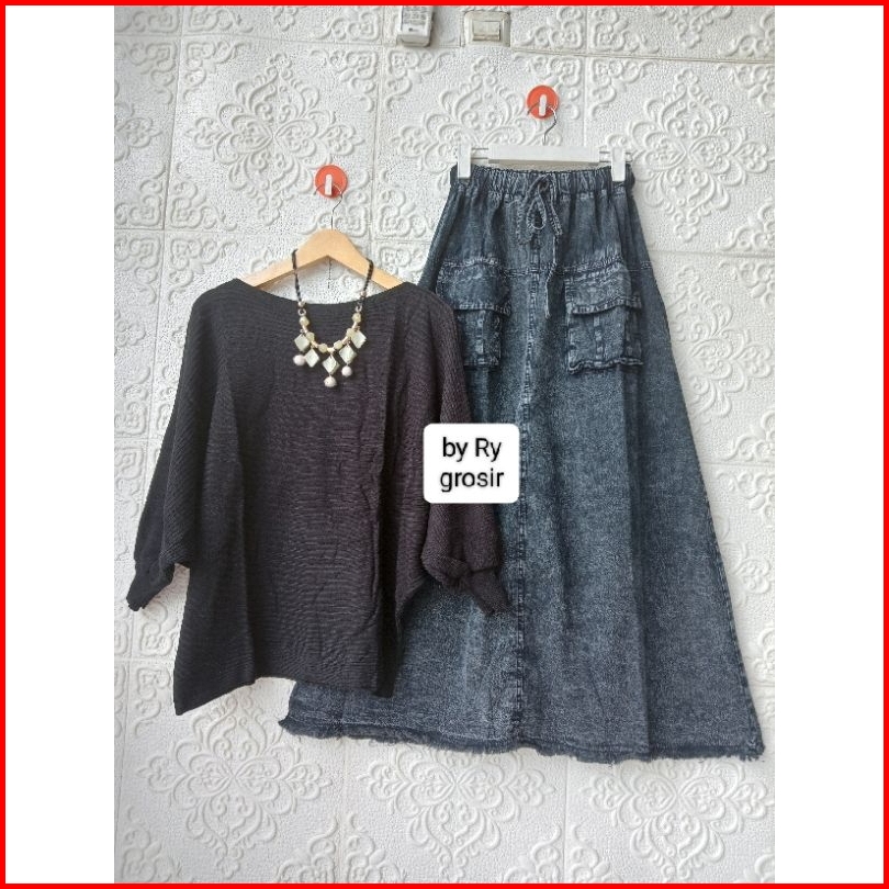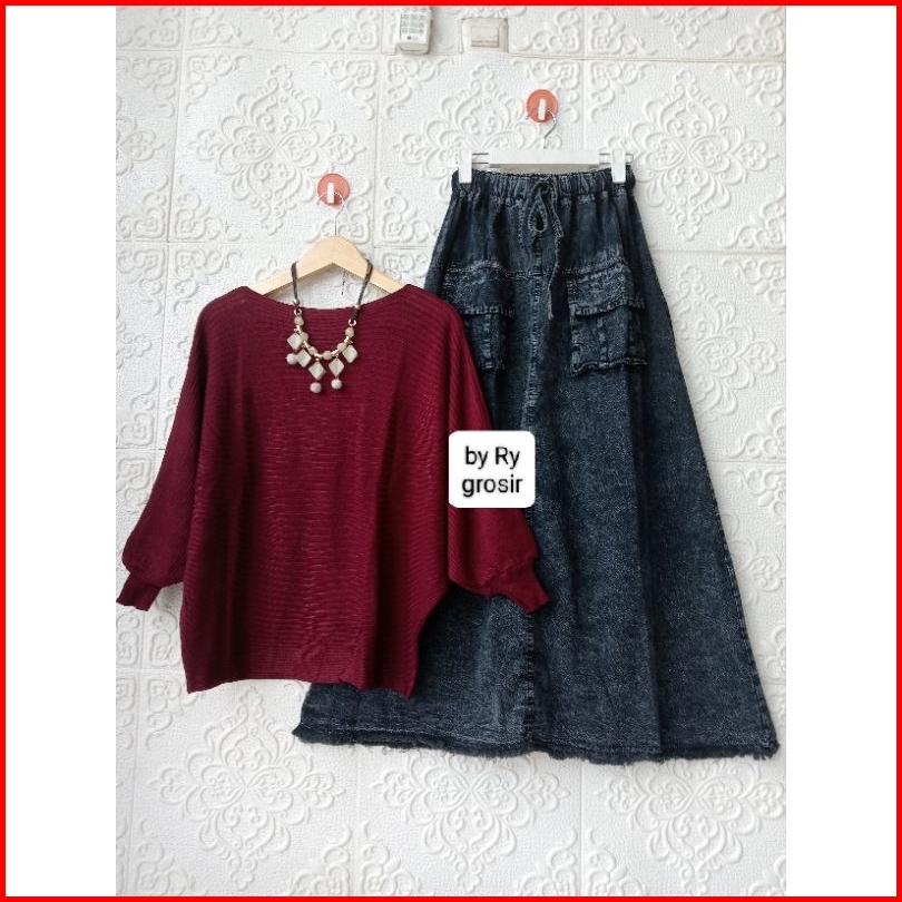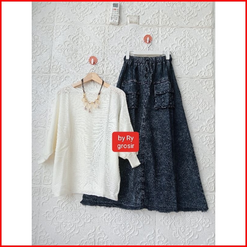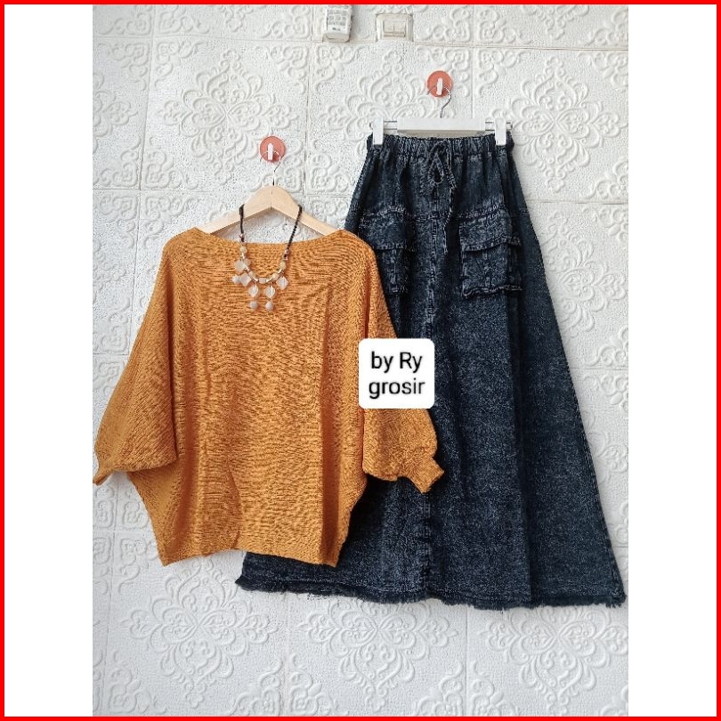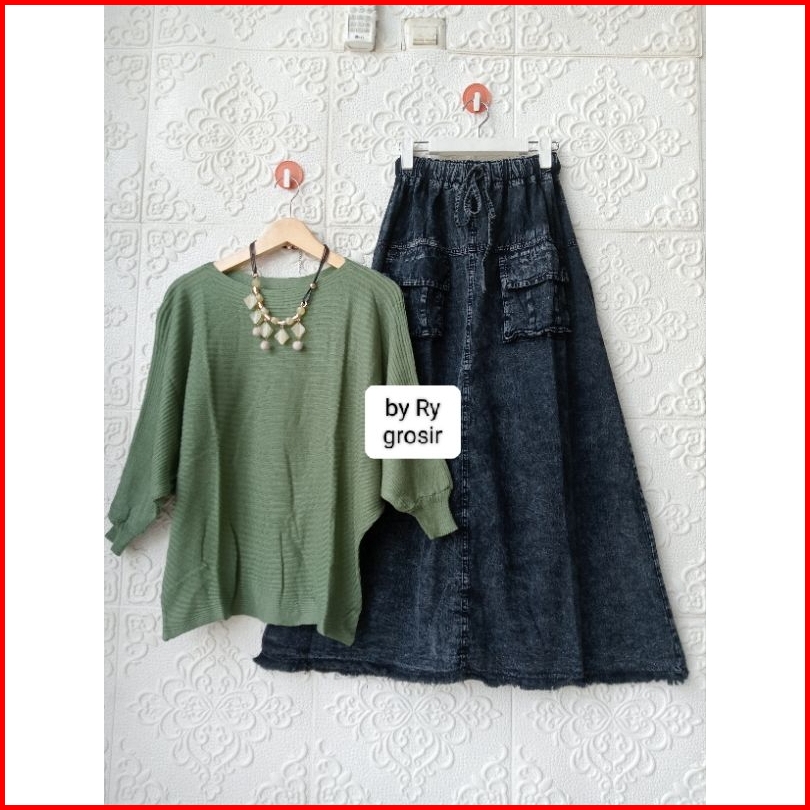 Setelan Wanita Blus Rajut Rok Kargo Jeans