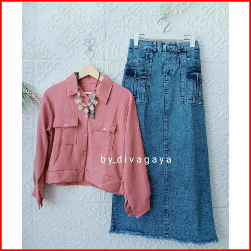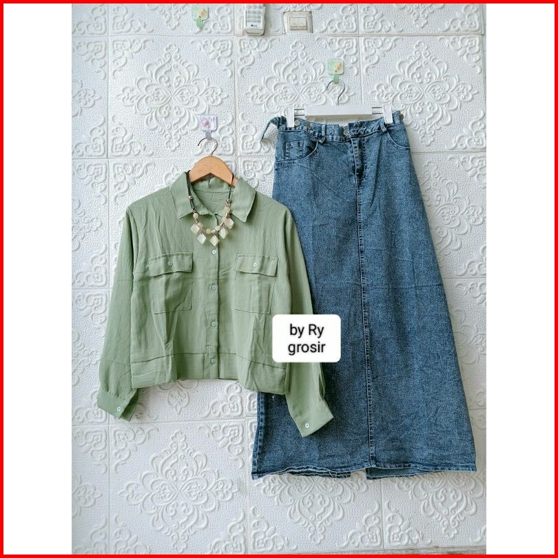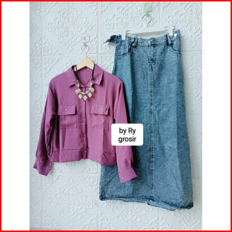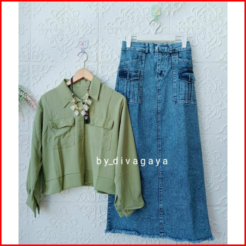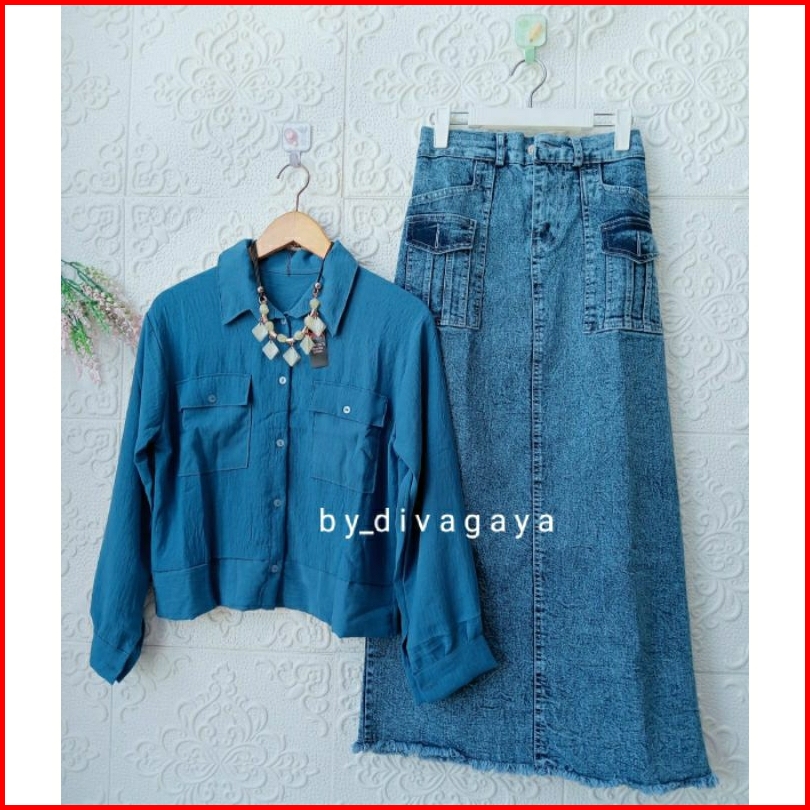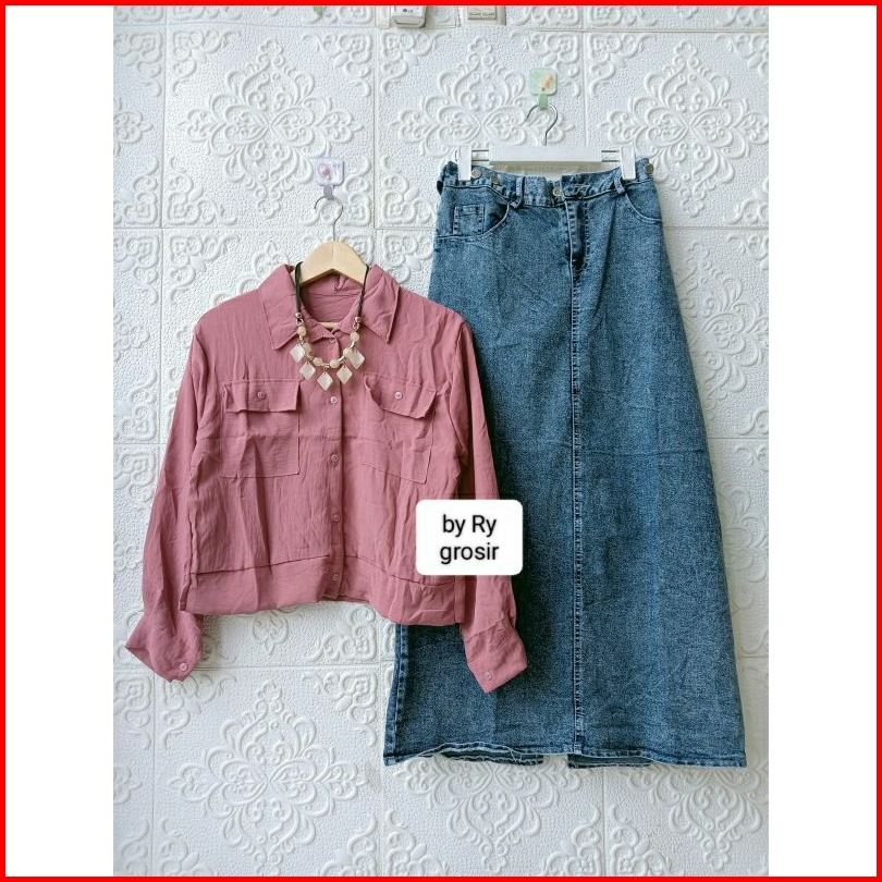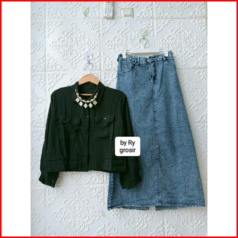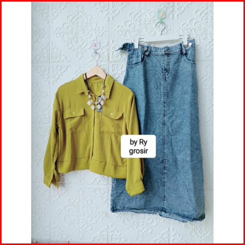 Setelan Wanita Silvi Kemeja Crop Crincle Rok Span Jeans