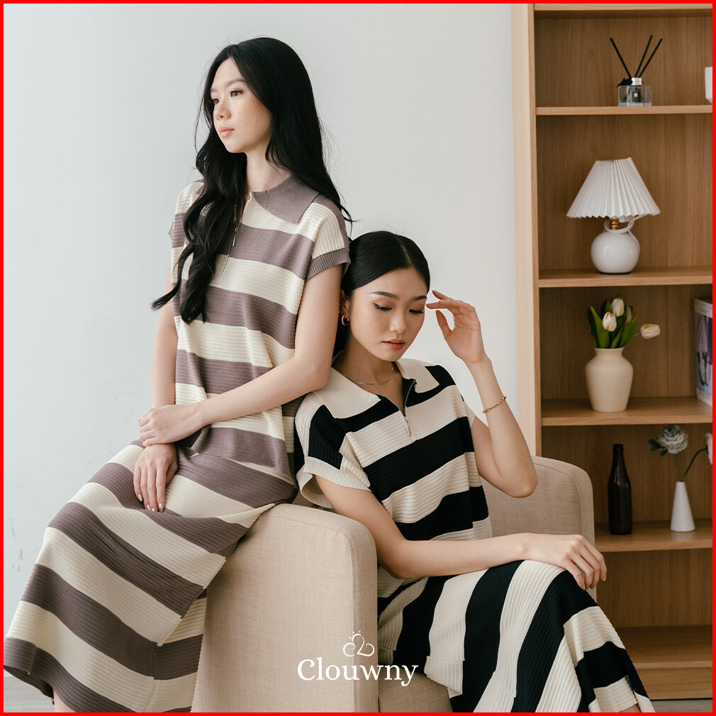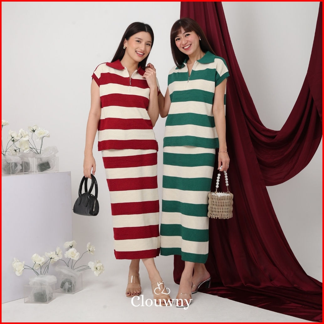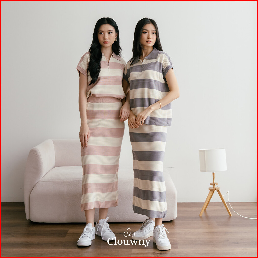 Clouwny Lyon Stripes Set Setelan Rok Wanita Lengan Pendek Korean Look Fit To Xxl