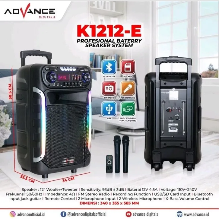 SPEAKER BLUETOOTH ADVANCE K1212E 12 INCH BONUS 2 MIC WIRELESS SPIKER BLUTUT FULL BASS ORIGINAL