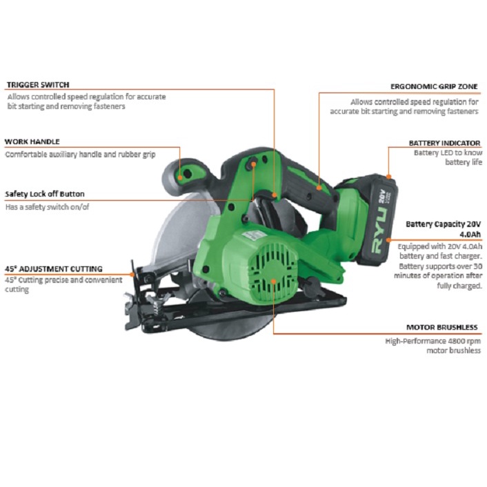 RYU CORDLESS CIRCULAR SAW 185 MM - MESIN SIRKEL BATERAI - PERKAKAS