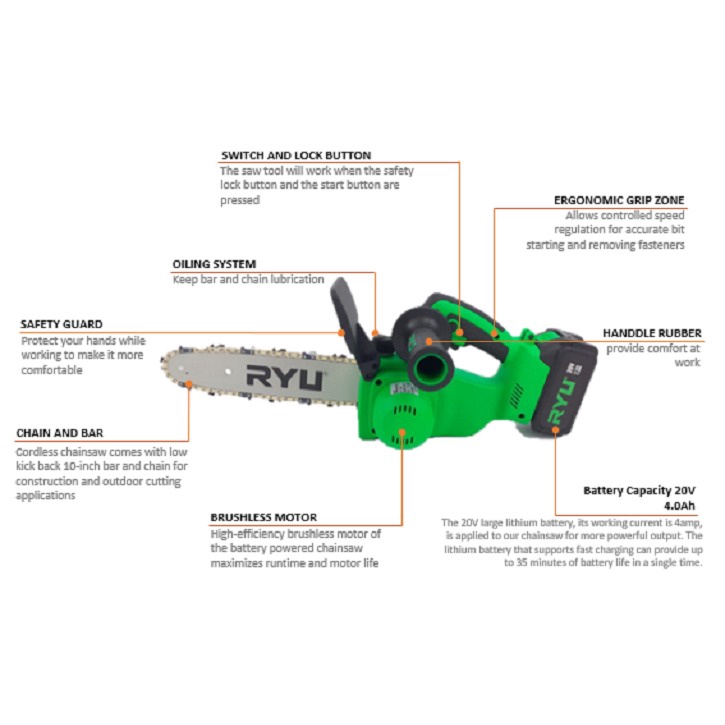 RYU CORDLESS CHAIN SAW 10 INCH - CHAIN SAW BATERAI RCCH10 - PERKAKAS