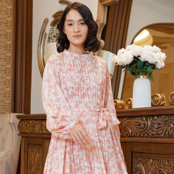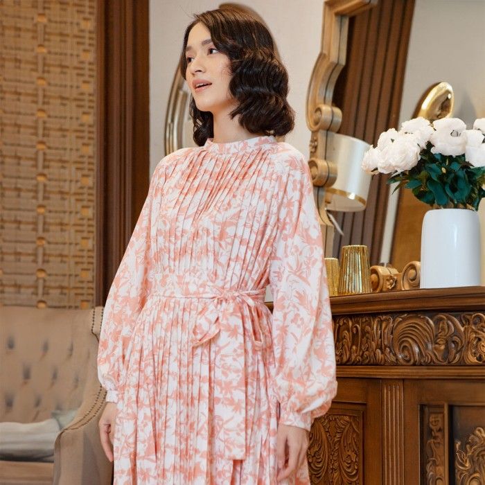 Baju Koko Original HijabChic x Sabrina Sosiawan Lunna Blushing Peach Dress | Gamis Plisket Floral dengan Lengan Raglan
