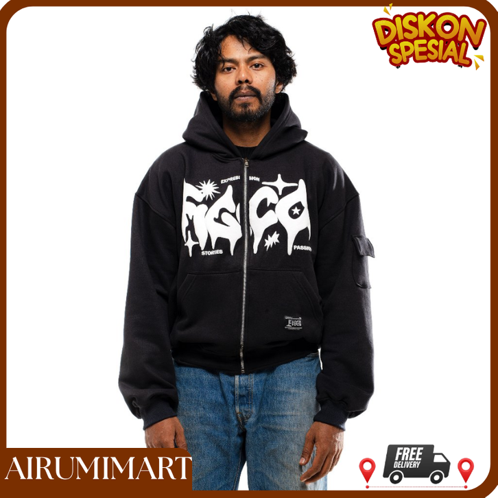 jaket pria keren Figco Hoodie Boxy Zipper Pocket Hitam Aura Black terlaris