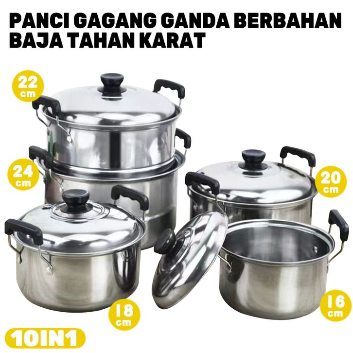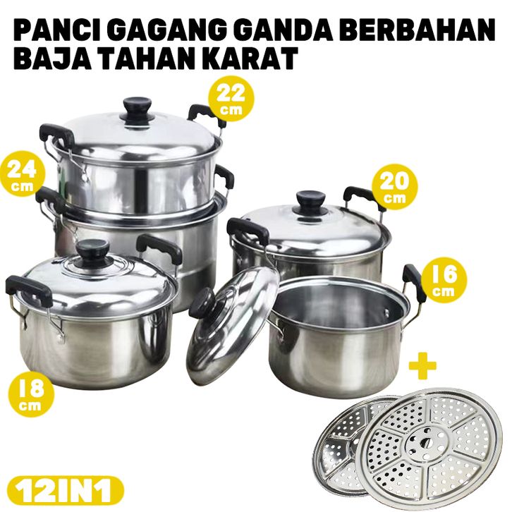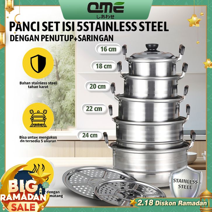 Panci Steamer Set Stainless isi 5 pcs + 2pcs Kukusan Panci Bahan Tebal PREMIUM QME 12in1