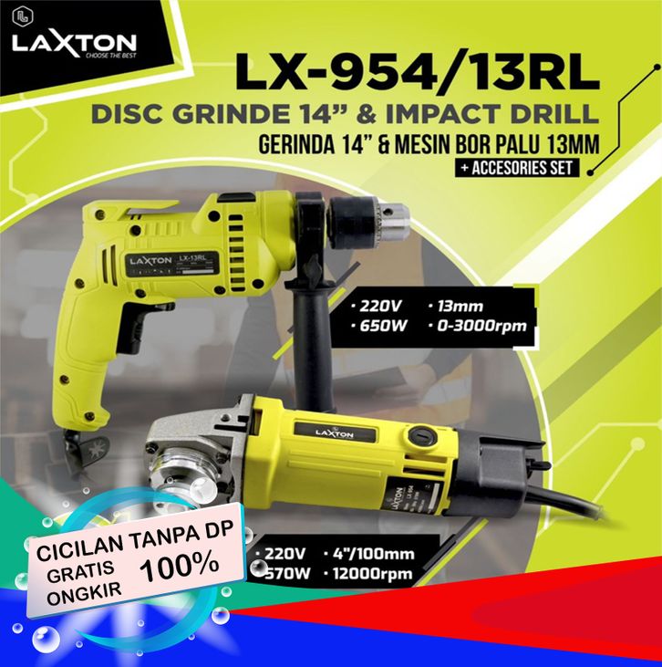 TANPA DP - LAXTON LX954/13RL PAKET MESIN GERINDA TANGAN ANGLE GRINDER DAN BOR BETON LISTRIK 13MM BOLAK-BALIK VARIABLE SP