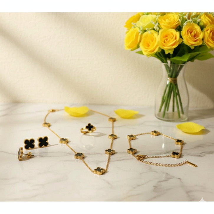Set Perhiasan Titanium Wanita Anti Karat Gelang Kalung Cincin Anting Bunga 5 Gerigi Bolak Balik Anti Luntur Elegan