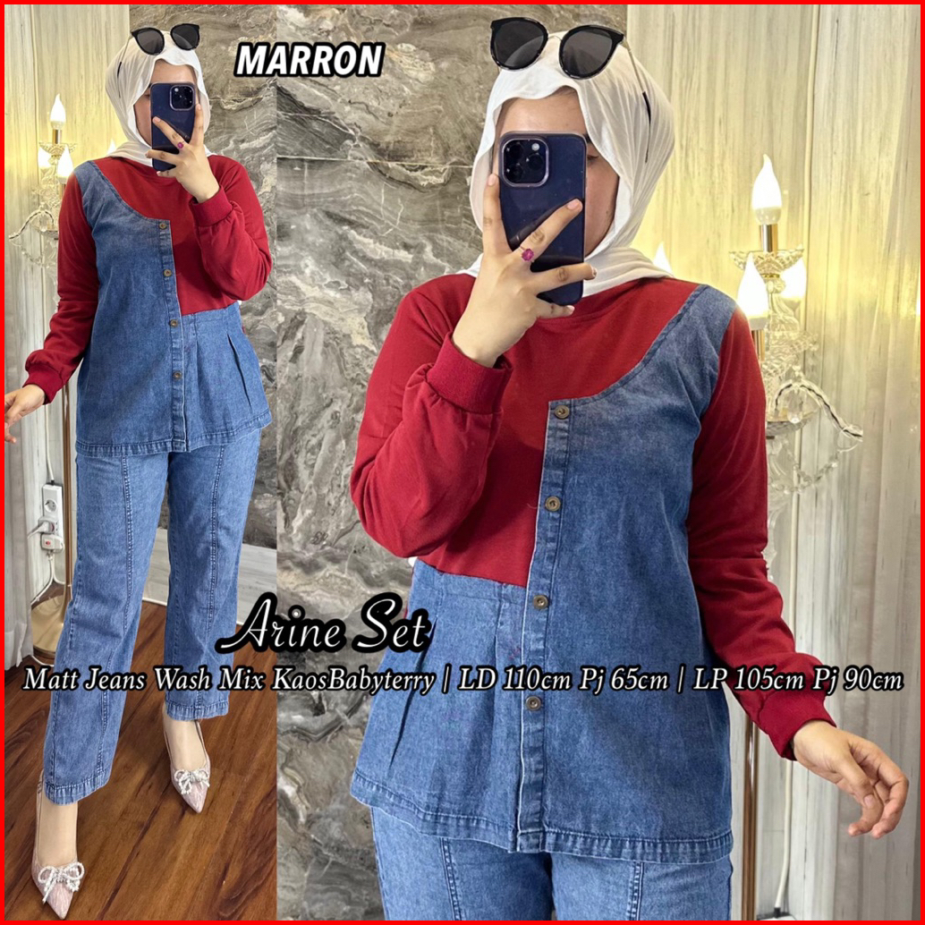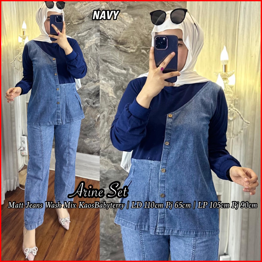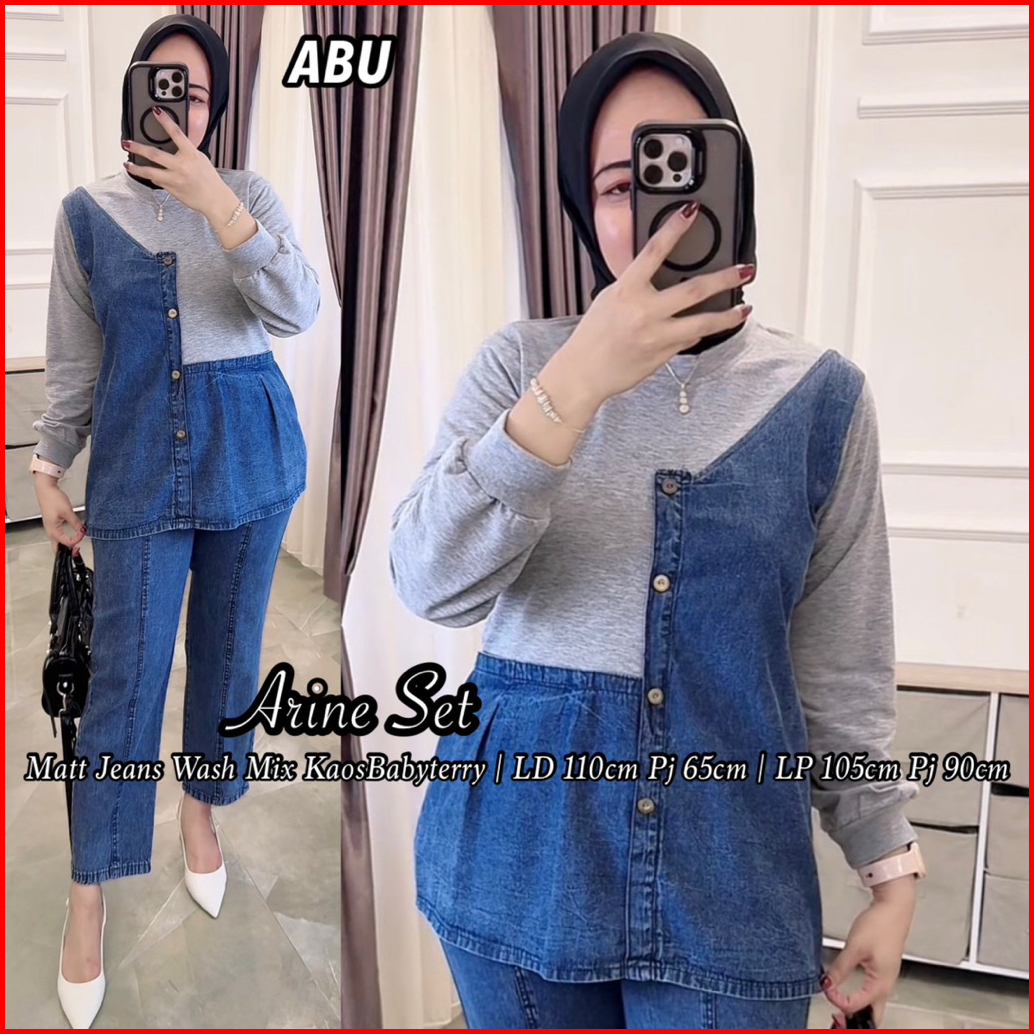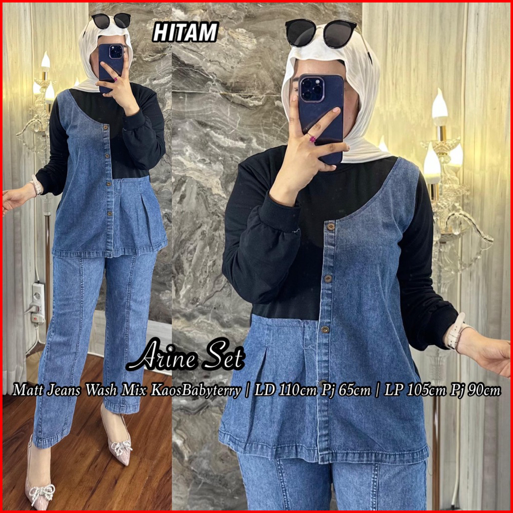 Setelan Celana Arine Jeans Wash Mix Babyterry Kaos Lembut Lengan Panjang Kekinian Hijab Friendly Kombinasi Baju Dewasa