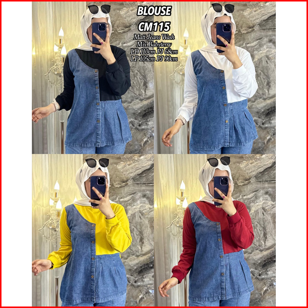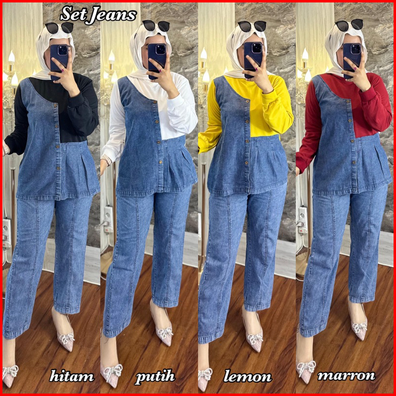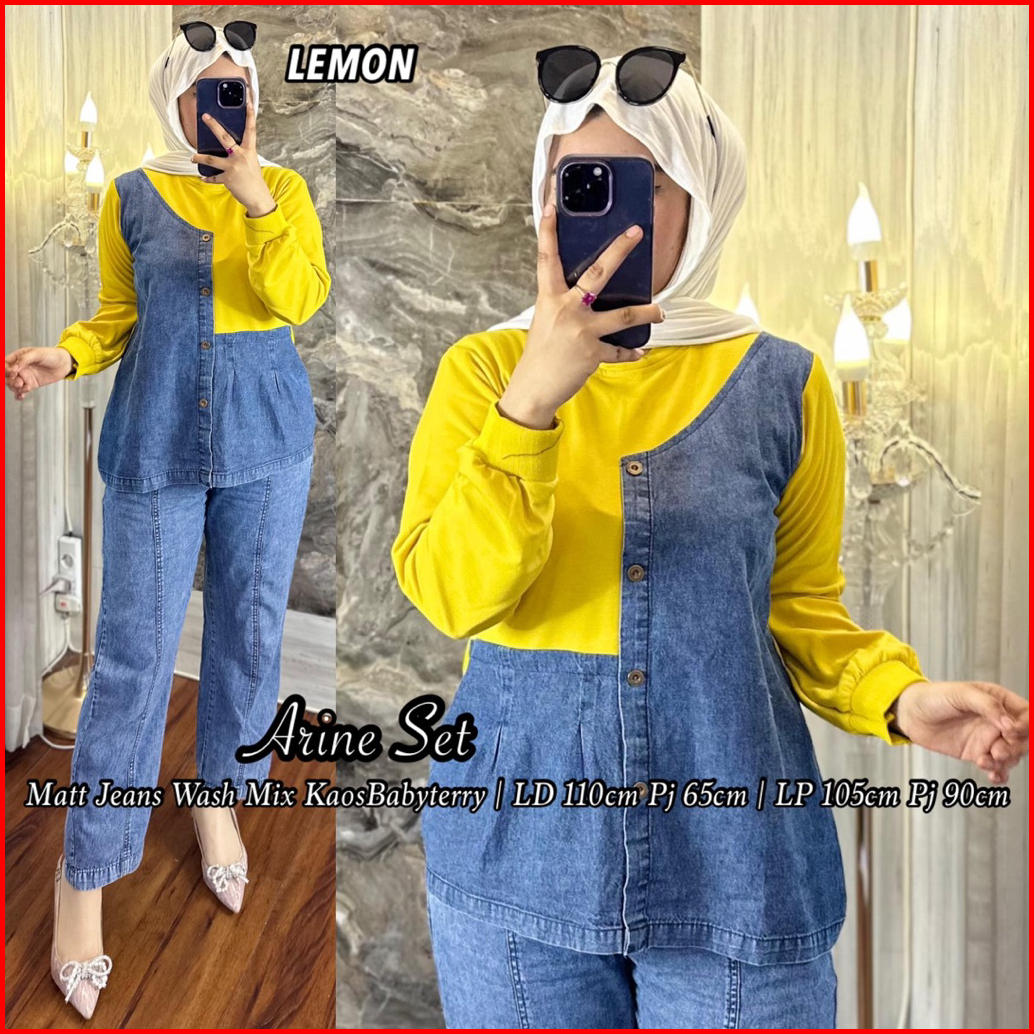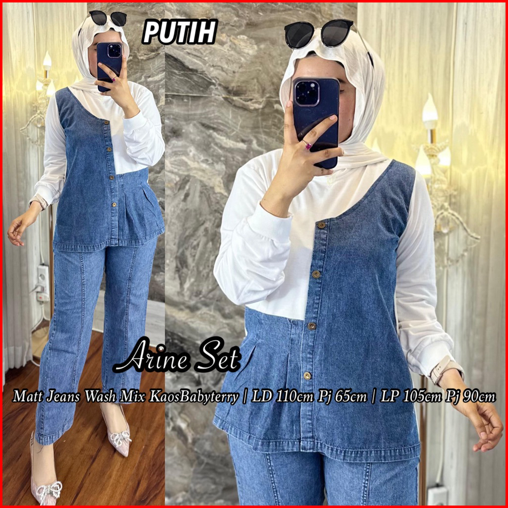 Setelan Celana Arine Jeans Wash Mix Babyterry Kaos Lembut Lengan Panjang Kekinian Hijab Friendly Kombinasi Baju Dewasa