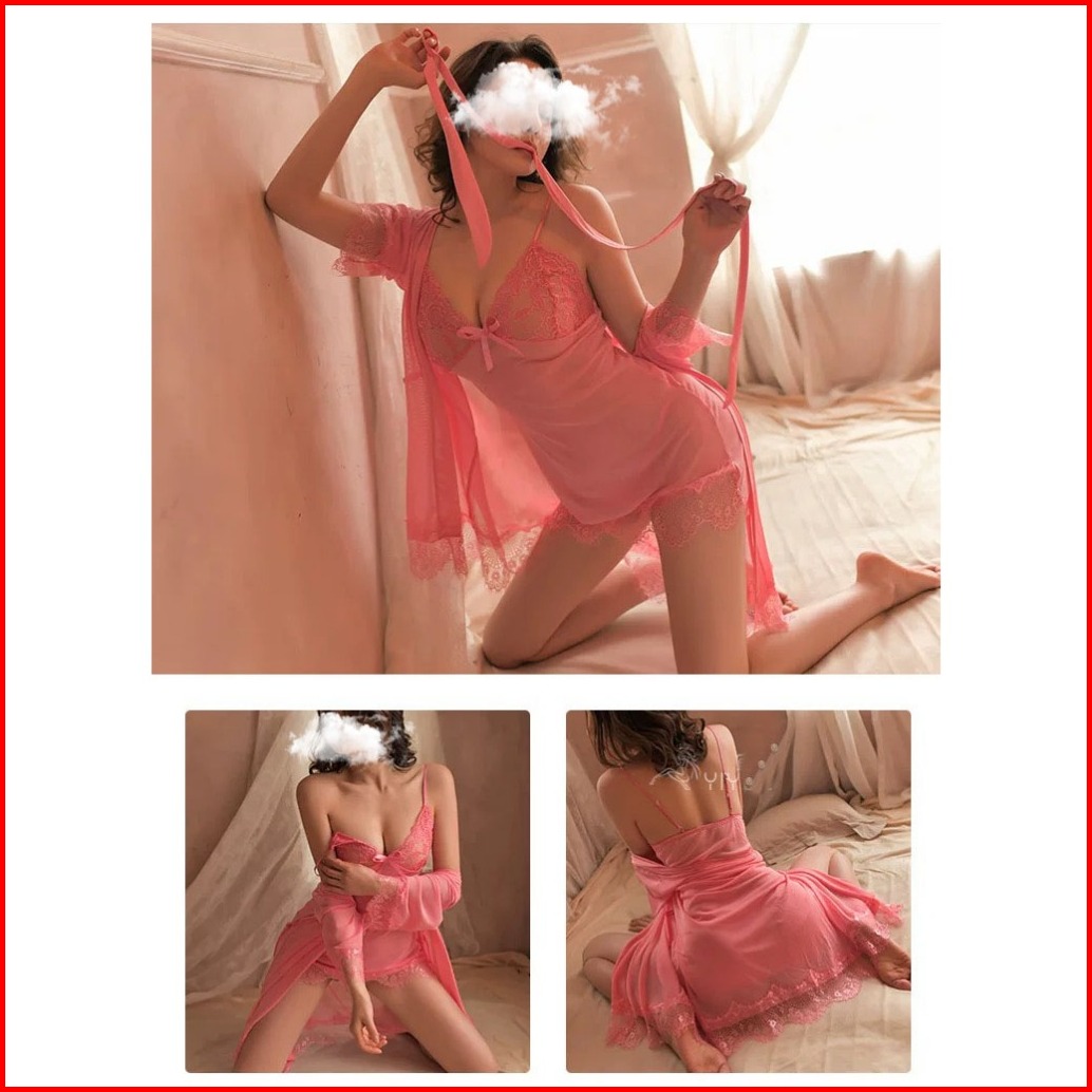 Baju Tidur Wanita Kimono Set Renda Transparan Piyama 3 In1 A2700
